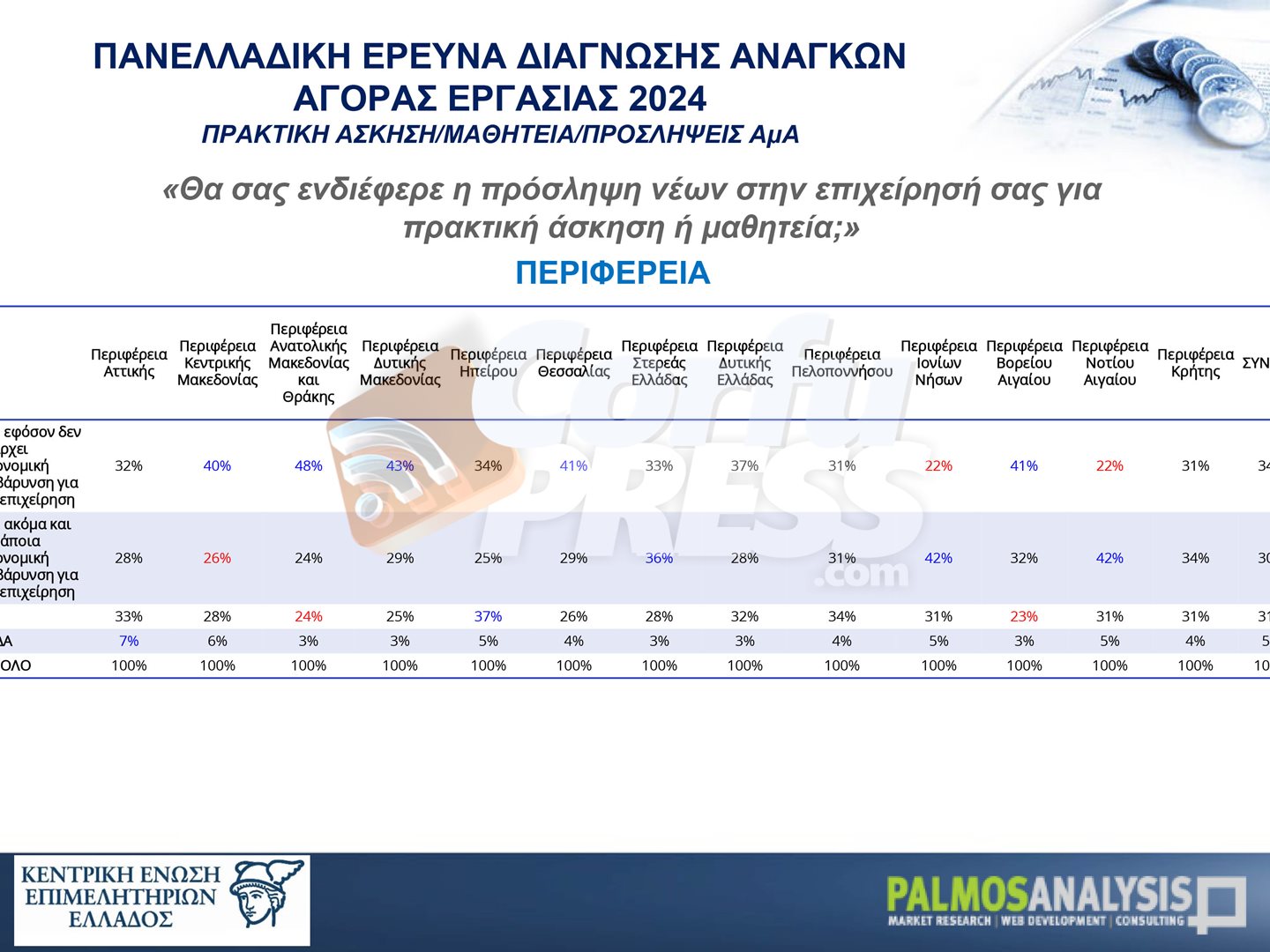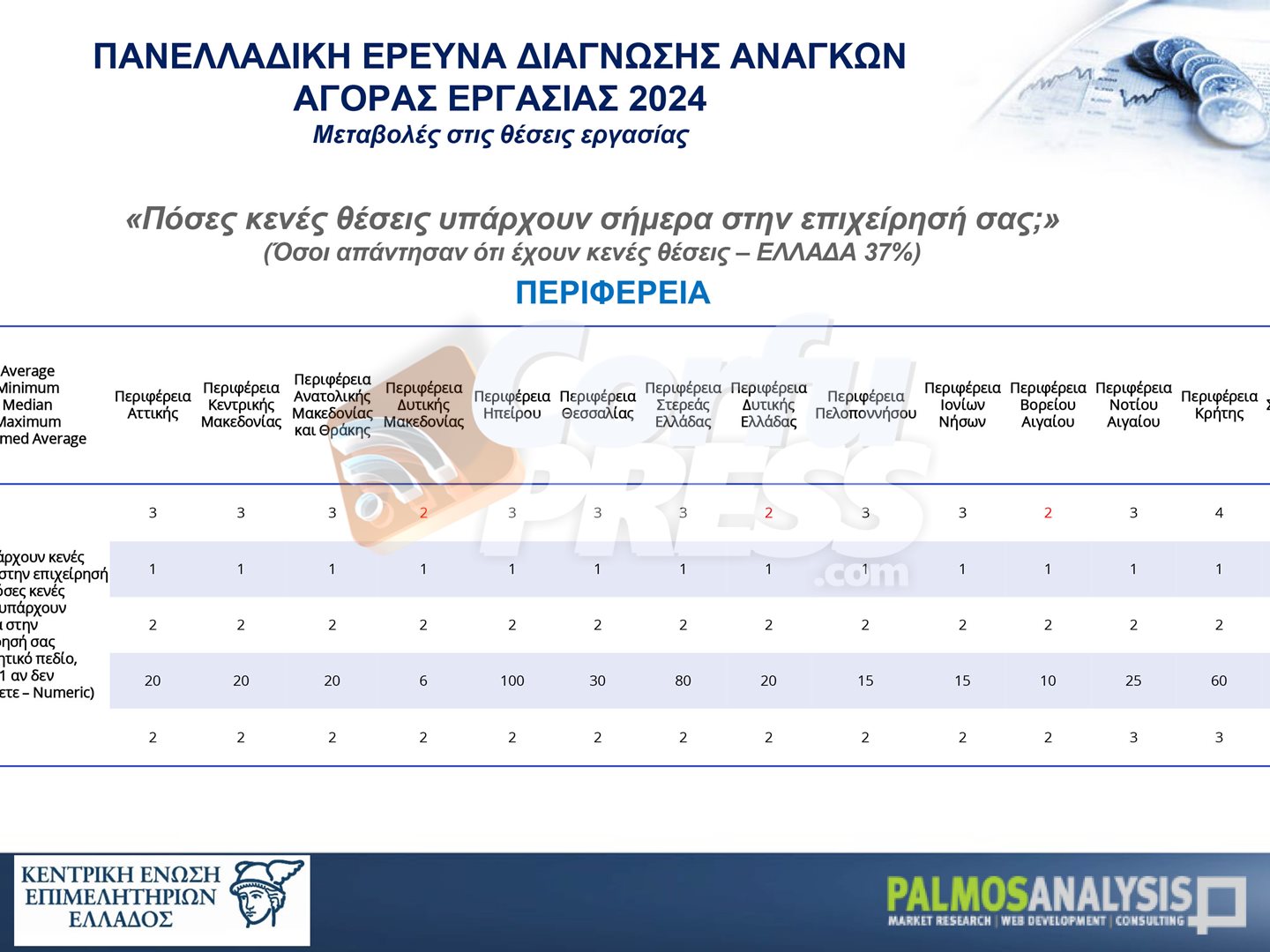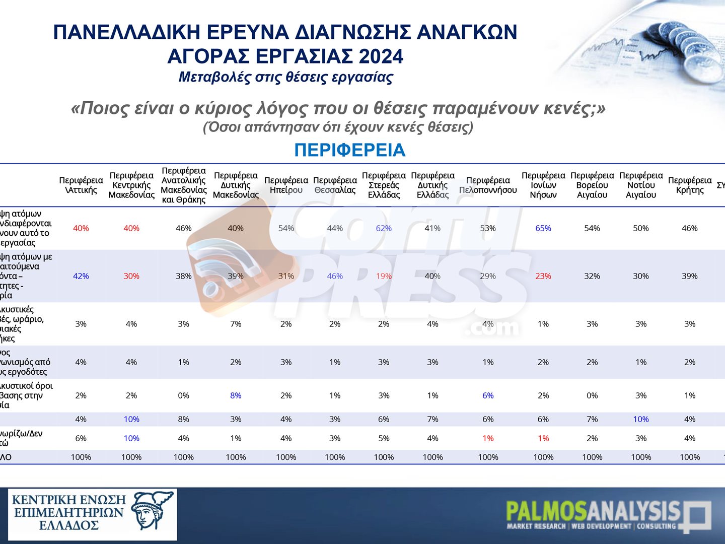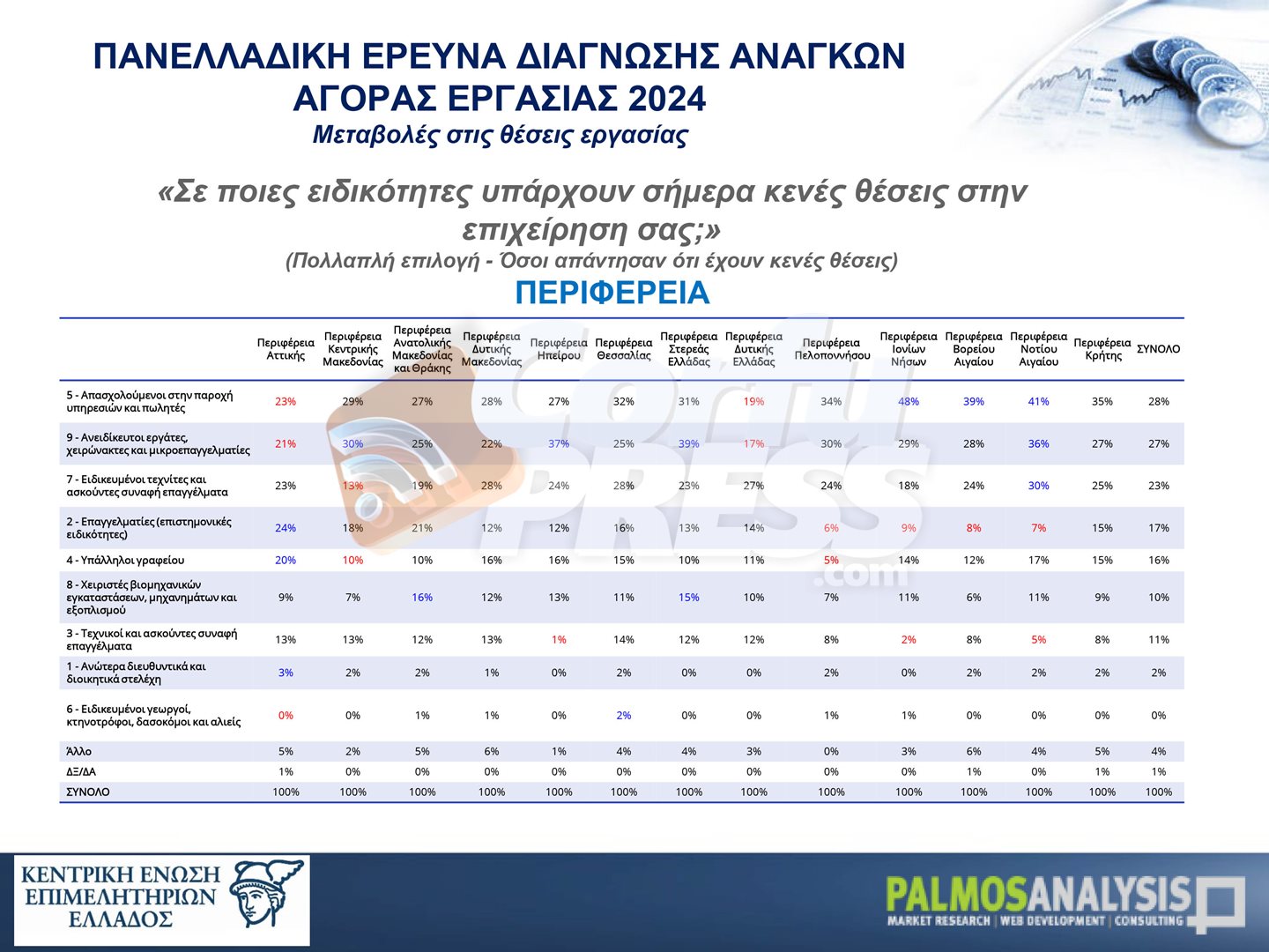 Σε μία πανελλαδική έρευνα που εκπόνησε η Palmos Analysis, καταγράφονται οι ανάγκες της αγοράς εργασίας τόσο σε ποσοτικό (αριθμός υφιστάμενων κενών θέσεων και εκτίμηση δημιουργίας νέων κενών θέσεων λόγω αποχώρησης/ συνταξιοδότησης ή επέκτασης δραστηριοτήτων) όσο και σε ποιοτικό επίπεδο (αναγκαίες επαγγελματικές ειδικότητες και εκπαιδευτικό επίπεδο εργαζομένων), σε ανθρώπινο δυναμικό.