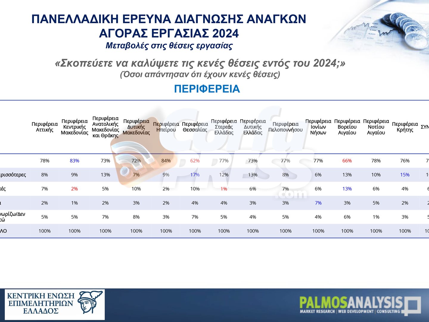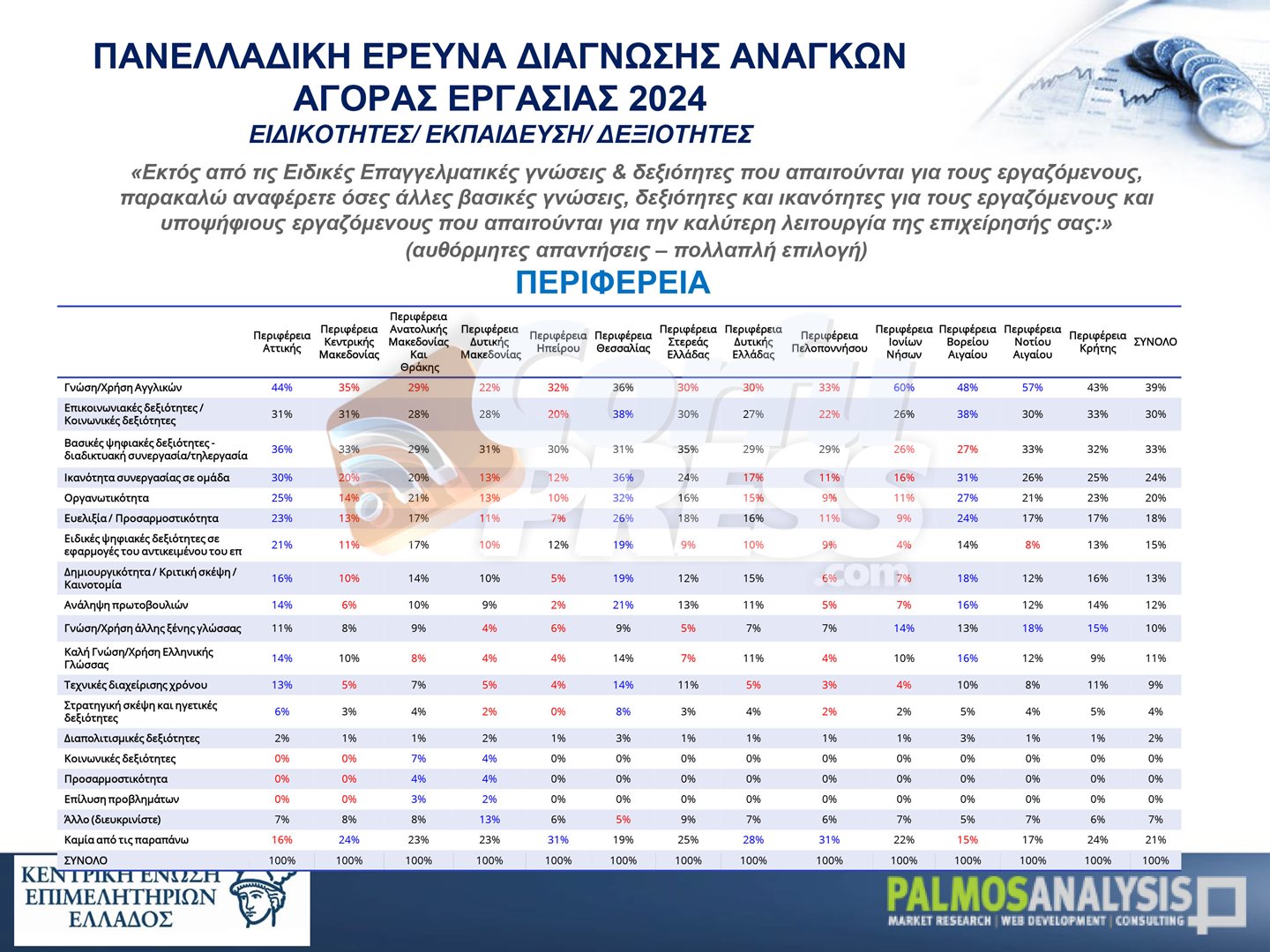 Σε μία πανελλαδική έρευνα που εκπόνησε η Palmos Analysis, καταγράφονται οι ανάγκες της αγοράς εργασίας τόσο σε ποσοτικό (αριθμός υφιστάμενων κενών θέσεων και εκτίμηση δημιουργίας νέων κενών θέσεων λόγω αποχώρησης/ συνταξιοδότησης ή επέκτασης δραστηριοτήτων) όσο και σε ποιοτικό επίπεδο (αναγκαίες επαγγελματικές ειδικότητες και εκπαιδευτικό επίπεδο εργαζομένων), σε ανθρώπινο δυναμικό.