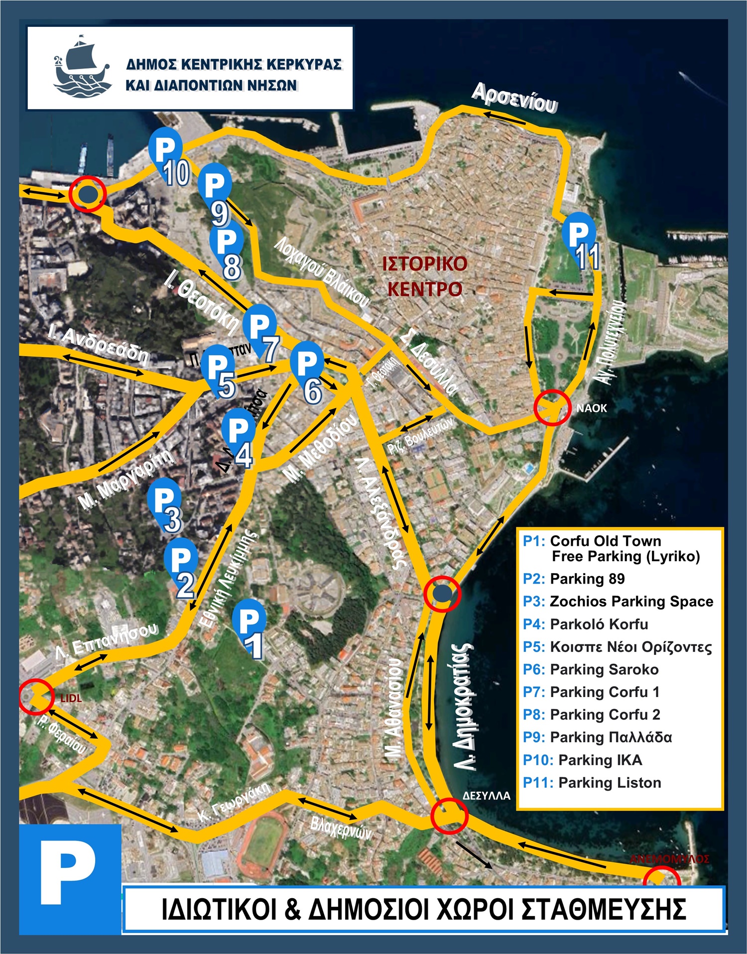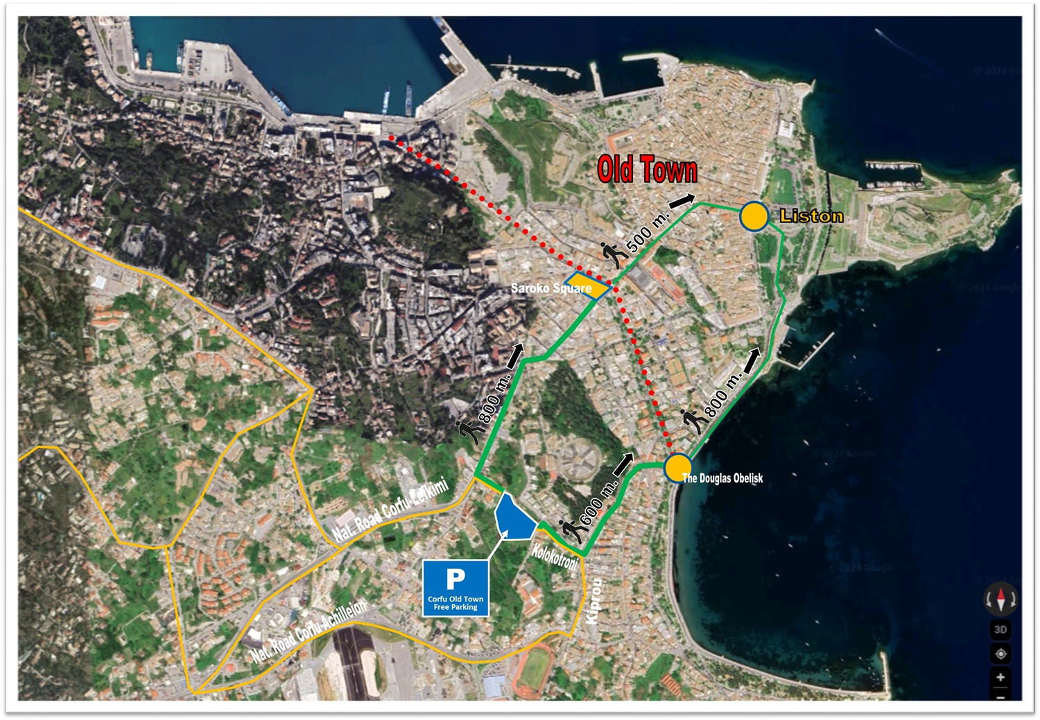 Όλοι οι διαθέσιμοι χώροι στάθμευσης, δημόσιοι και ιδιωτικοί, απέχουν 10 – 15 λεπτά από το ιστορικό κέντρο της Κέρκυρας και είναι προτιμότερο να περπατήσετε αυτήν την μικρή απόσταση, παρά να εγκλωβιστείτε στο αυτοκίνητό σας σε μια μάταιη και αναποτελεσματική προσπάθεια ανεύρεσης χώρου στάθμευσης.