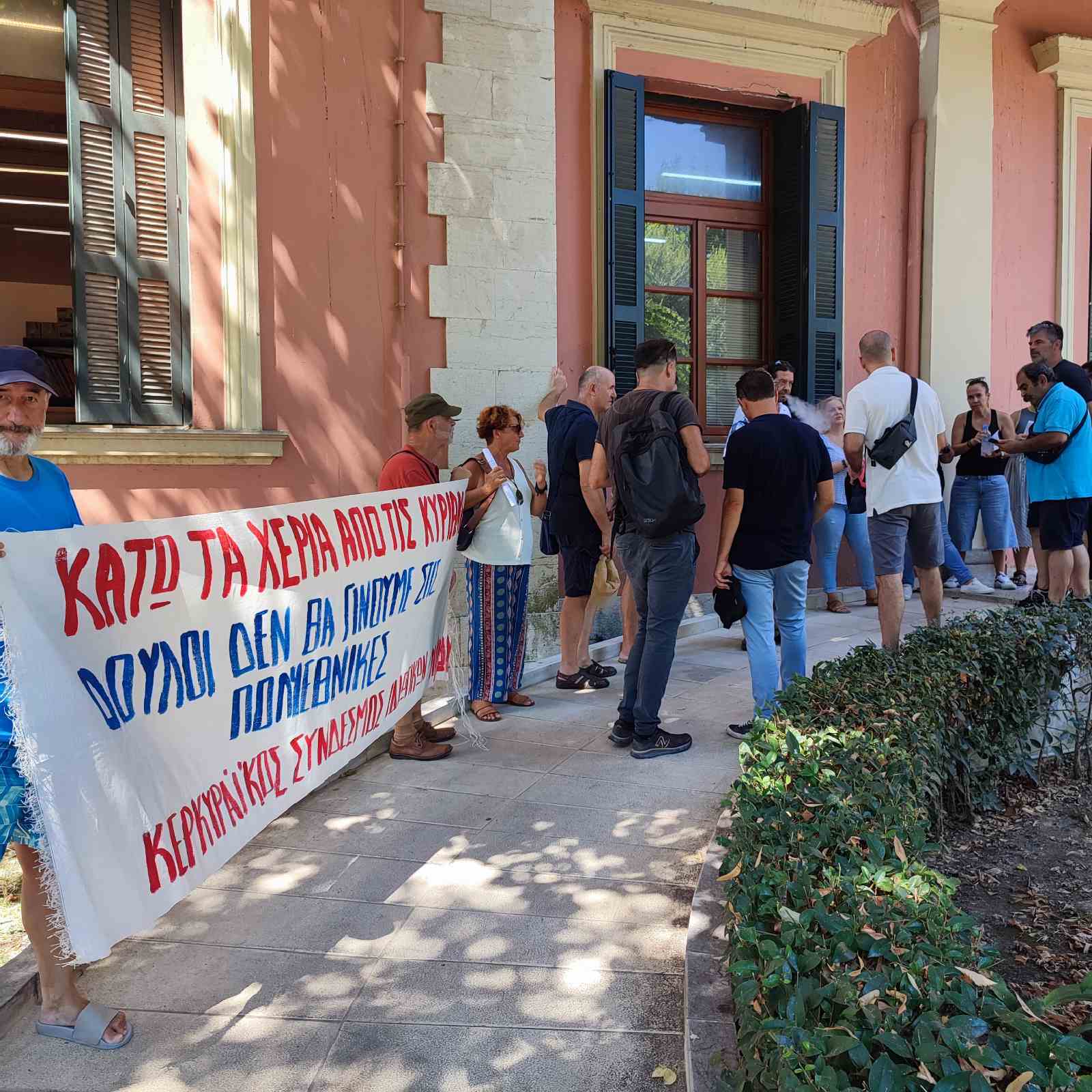 Την Τετάρτη 7/8 ο Κερκυραϊκός Σύνδεσμος Ιδιωτικών Υπαλλήλων και εργαζόμενοι από τον χώρο του εμπορίου πραγματοποίησαν παράσταση διαμαρτυρίας στο Μαράσλειο δημαρχιακό μέγαρο, ενάντια στην απόφαση του Δημάρχου Κεντρικής Κέρκυρας να εκδώσει απόφαση, με την οποία δίνει την άδεια στους μεγαλοεπιχειρηματίες του εμπορίου να ανοίγουν τα καταστήματά τους όλες τις Κυριακές της θερινής περιόδου (1/5 έως 31/10) κάθε έτους.