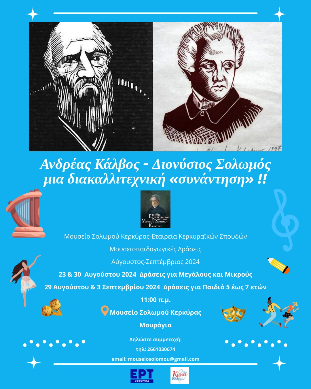 Η Εταιρεία Κερκυραϊκών Σπουδών-Μουσείο Σολωμού Κέρκυρας διοργανώνει για την περίοδο Αυγούστου-Σεπτεμβρίου 2024 Μουσειοπαιδαγωγικές Διακαλλιτεχνικές Δράσεις συνεχίζοντας το παιδαγωγικό της έργο.