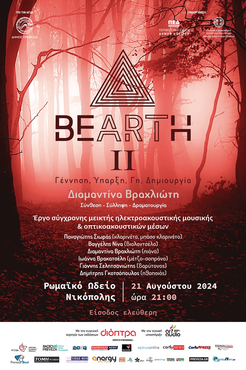 Στις 21 Αυγούστου 2024 και ώρα 9:00 μ.μ. στο Ρωμαϊκό Ωδείο Νικόπολης θα παρουσιαστεί το έργο BEartH ΙΙ της Διαμαντίνας Βραχλιώτη. Η συνθέτις και πιανίστα με καταγωγή από την Κέρκυρα, διανύει μια διακεκριμένη πορεία στο χώρο της Σύγχρονης Κλασικής Μουσικής Δημιουργίας.
