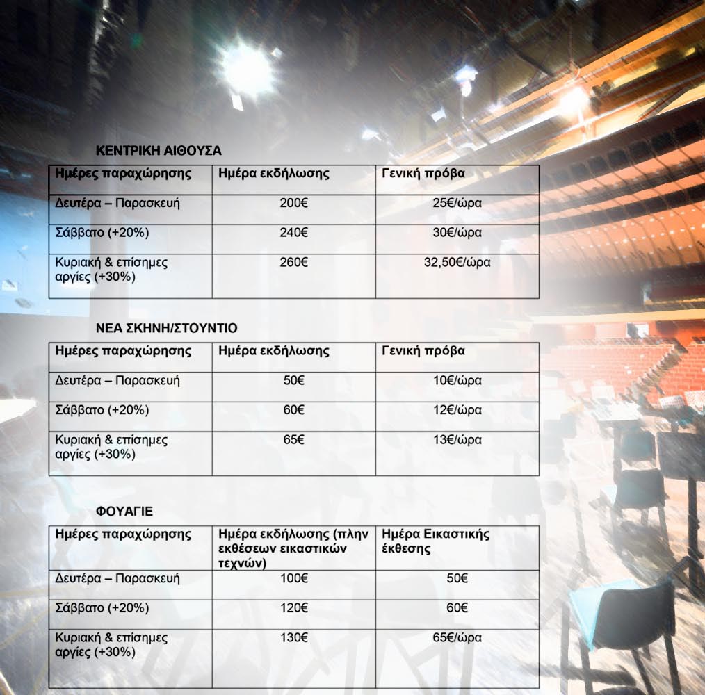 Β. Καταβάλλεται αντίτιμο δικαιώματος για την παραχώρηση χρήσης των χώρων του Δημοτικού Θεάτρου από τους φορείς του άρθρου 8, ως κατωτέρω: α) Για τη χρήση της Κεντρικής Αίθουσας και της Νέας Σκηνής από όλους τους φορείς ή φυσικά πρόσωπα για την πραγματοποίηση συναυλιών και παραστάσεων που αναφέρονται στο άρθρο 7. β )Για τη χρήση των χώρων του Θεάτρου από τους υποψήφιους συνδυασμούς των τοπικών, περιφερειακών και εθνικών εκλογών για τις κεντρικές ομιλίες τους και από τα άτομα – υποψηφίους των αντίστοιχων εκλογικών διαδικασιών για τις ατομικές – μεμονωμένες ομιλίες τους για την πραγματοποίηση εκδηλώσεων που αναφέρονται στο άρθρο 7. γ) Για τη χρήση του Φουαγιέ ή του Στούντιο για την πραγματοποίηση ατομικών ή ομαδικών εικαστικών εκθέσεων. δ) Για τη χρήση των προβλεπόμενων από τον παρόντα κανονισμό χώρων από τις συνδικαλιστικές οργανώσεις για την πραγματοποίηση γενικών συνελεύσεων και εκλογικών 12 διαδικασιών και από τα κόμματα για την διενέργεια των εκλογικών τους διαδικασιών.