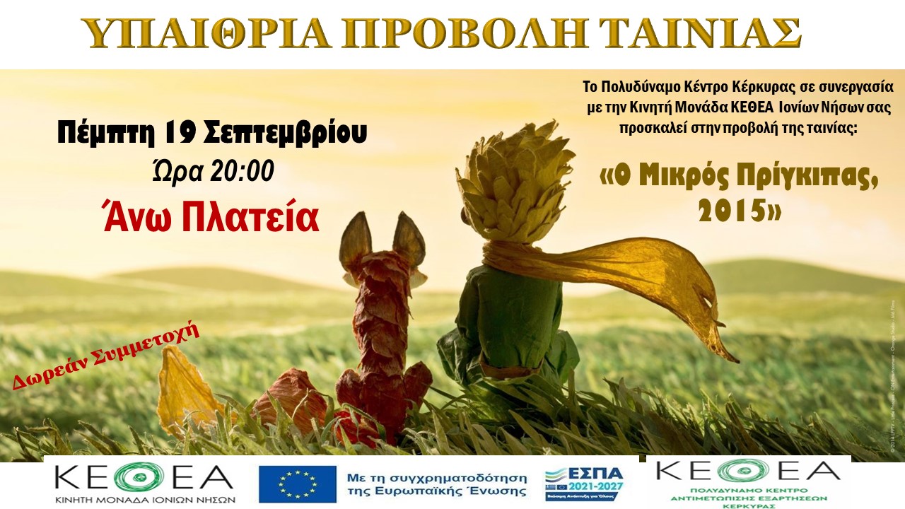 Το Πολυδύναμο Κέντρο Αντιμετώπισης Εξαρτήσεων Κέρκυρας και η Κινητή Μονάδα Ιονίων Νήσων με έδρα την Κεφαλονιά του ΚΕΘΕΑ, σας προσκαλούν στην υπαίθρια προβολή ταινίας Ο Μικρός Πρίγκιπας (2015).