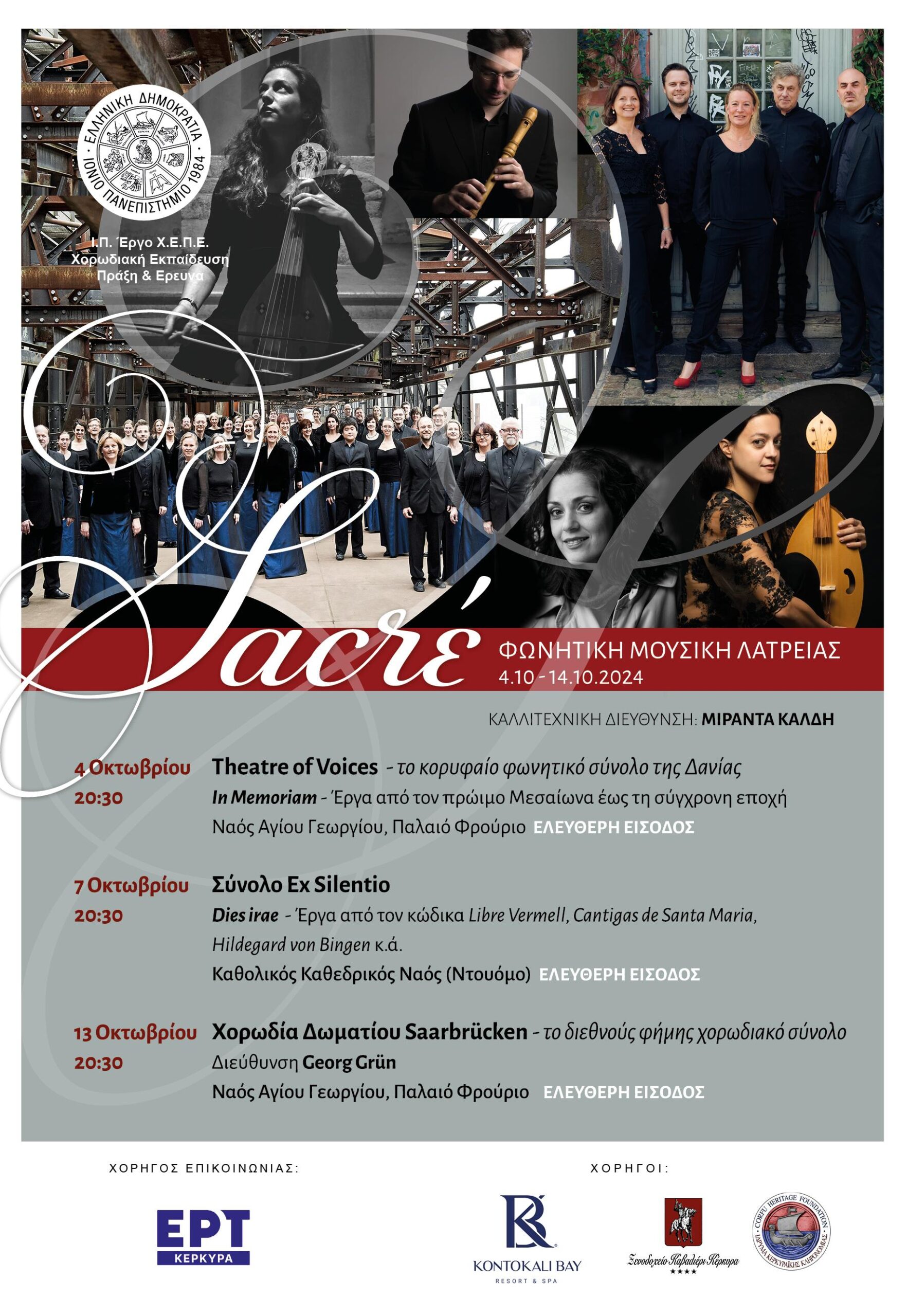 Οι εκδηλώσεις Φωνητικής Μουσικής Λατρείας «Sacré», που θα πραγματοποιηθούν στην Κέρκυρα στις 4-13 Οκτωβρίου 2024, θα περιέχουν μια σειρά από ιδιαίτερες συναυλίες μουσικής λατρείας από τις δυτικές και ανατολικές παραδόσεις του κόσμου.
