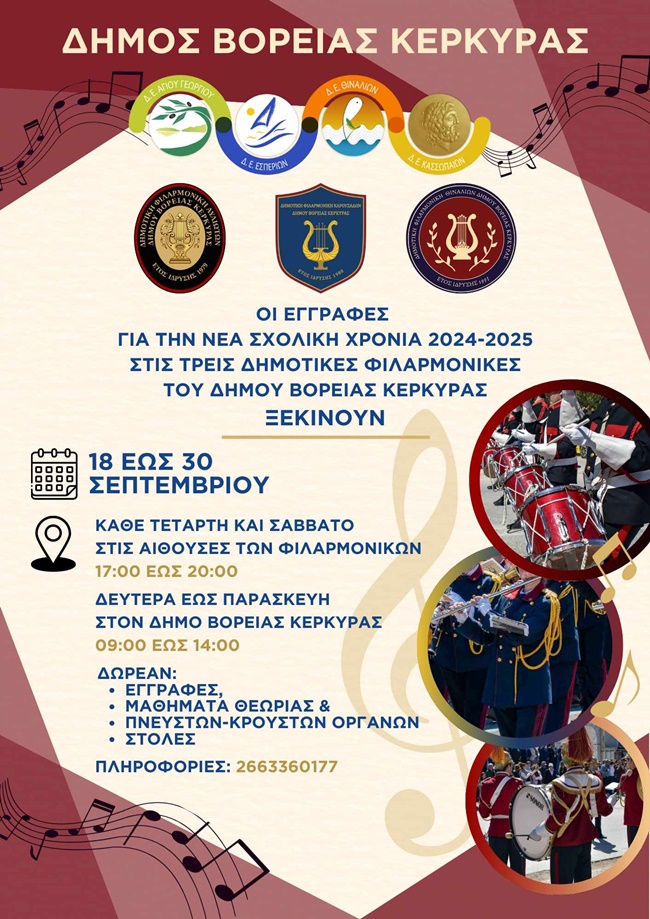 Με δεδομένο λοιπόν ότι ο πολιτισμός υπάρχει, τρέφεται, προχωράει, εξελίσσεται μέσα από ανθρώπους, μέσα από νέα παιδιά, που σε πείσμα των καιρών, δημιουργούν υπηρετώντας τις τέχνες… ο Δήμος Βόρειας Κέρκυρας – καλύπτοντας τη μουσική τους «δίψα»- αναβαθμίζει τις τρεις δημοτικές φιλαρμονικές για να γίνουν φυτώρια μουσικής γνώσης και αποτελέσματος. Με στόχο τα παραπάνω προχωρά σε μια σειρά πραγμάτων/κινήσεων που αφενός θα συμβάλλουν στο νέο μουσικό ξεκίνημα που θα αλλάξει τα δεδομένα στην περιοχή μας αφετέρου θα κρατήσει ψηλά την ποιότητα και την μουσική γνώση, για τα επόμενα χρόνια .