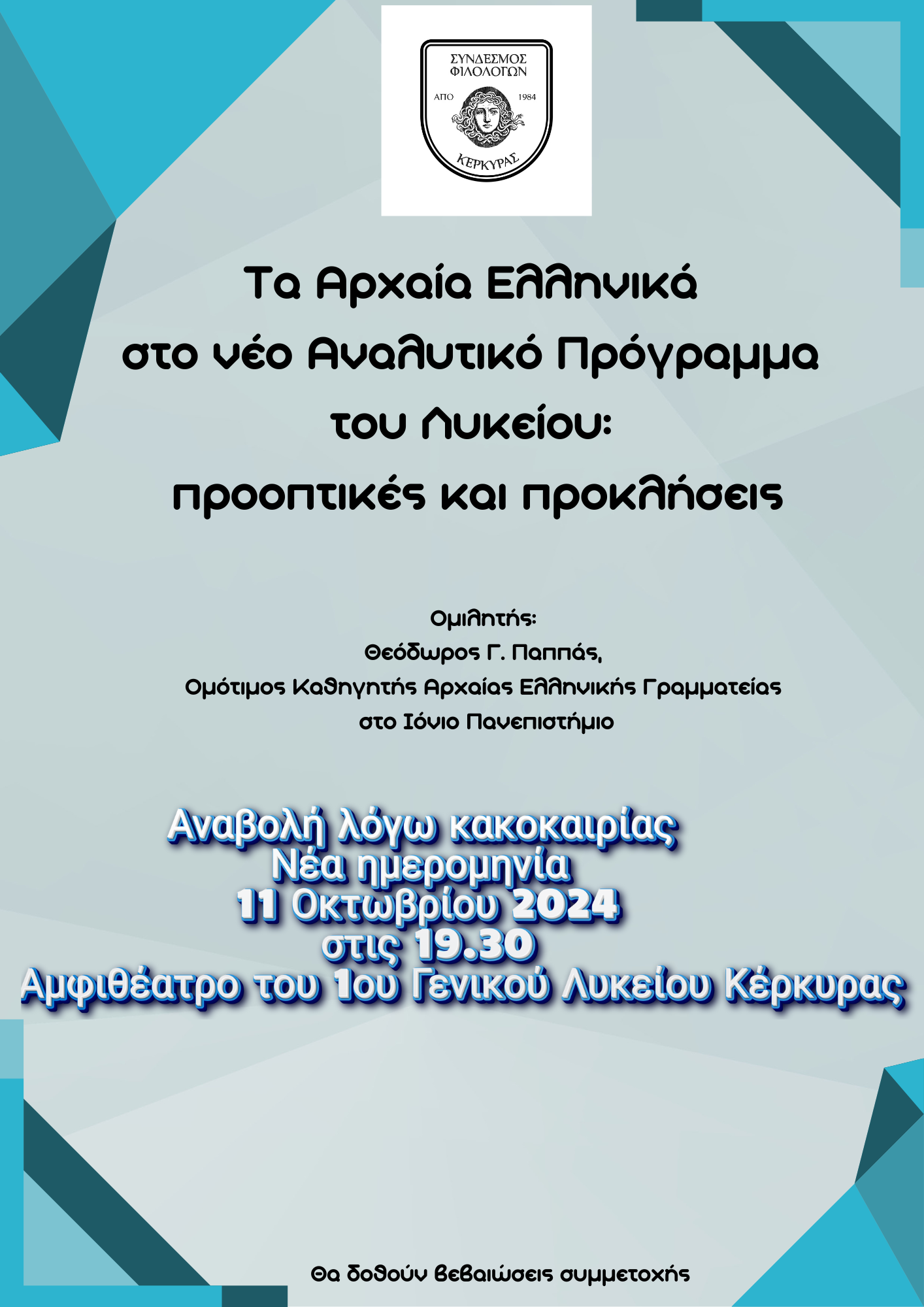 Την Παρασκευή 11 Οκτωβρίου θα πραγματοποιηθεί εκδήλωση από τον Σύνδεσμο Φιλολόγων Κέρκυρας με θέμα Τα Αρχαία Ελληνικά στο νέο Αναλυτικό Πρόγραμμα του Λυκείου
