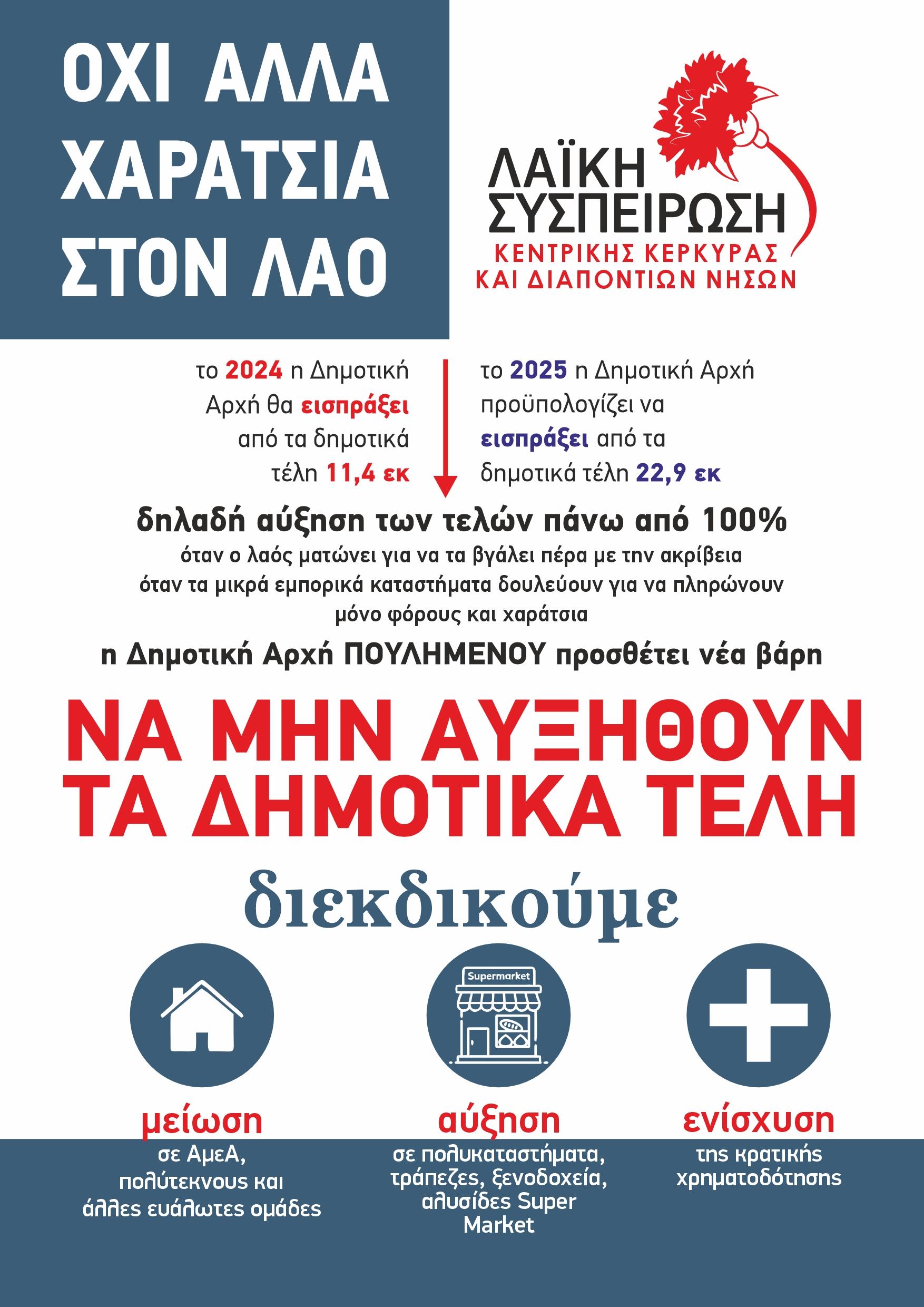 Την ώρα που οι εργαζόμενοι και τα λαϊκά στρώματα δίνουν καθημερινή και άνιση μάχη να βγάλουν το μήνα, η Δημοτική Αρχή επιλέγει να προχωρήσει σε αύξηση των δημοτικών τελών πάνω από 100% (από 11 εκατομμύρια ευρώ που θα εισπράξει το 2024 επιδιώκει αύξηση στα 22 εκατομμύρια ευρώ το 2025!!!).
