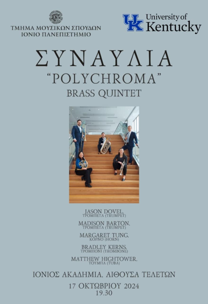 Ένα ξεχωριστό σύνολο μουσικής δωματίου από τις Ηνωμένες πολιτείες δίνει συναυλία την Πέμπτη στην Ιόνιο Ακαδημία. Πρόκειται για το PolyChroma Brass Quintet που αποτελείται από Καθηγητές της Μουσικής Σχολής του Πανεπιστημίου του Kentucky.