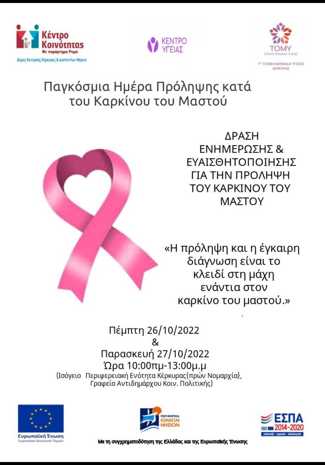 Με αφορμή τη Διεθνή καθιέρωση του μήνα Οκτωβρίου ως μήνας πρόληψης και ενημέρωσης του Καρκίνου του Μαστού, με παγκόσμια μέρα κατά του Kαρκίνου του Mαστού την 25η Οκτωβρίου και στα πλαίσια της προστασίας και της προαγωγής της υγείας των πολιτών, θα πραγματοποιηθεί εβδομάδα εκδηλώσεων και δράσεων δρόμου για την ενημέρωση και ευαισθητοποίηση του κοινού, από τις 21 έως τις 25 Οκτωβρίου 2024.