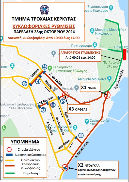 Κυκλοφοριακές ρυθμίσεις στα πλαίσια των εκδηλώσεων εορτασμού της Εθνικής Επετείου της 28ης Οκτωβρίου, τη Δευτέρα 28 Οκτωβρίου 2024 , από ώρες 00.01 έως 14:00, στην πόλης της Κέρκυρας