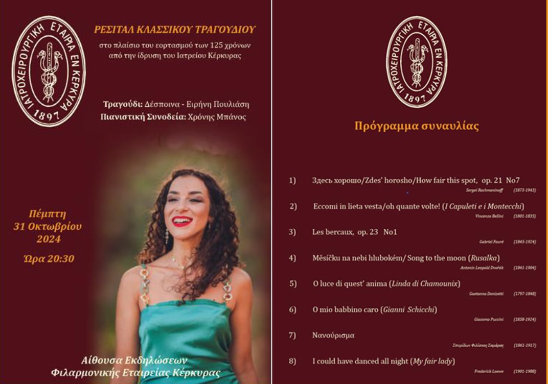Ρεσιτάλ κλασσικού τραγουδιού στο πλαίσιο του εορτασμού των 125 χρόνων από την ίδρυση του Ιατρείου Κέρκυρας. Την Πέμπτη 31 Οκτωβρίου στην αίθουσα εκδηλώσεων της Φιλαρμονικής Εταιρείας Κέρκυρας.