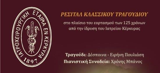 Ρεσιτάλ κλασσικού τραγουδιού στο πλαίσιο του εορτασμού των 125 χρόνων από την ίδρυση του Ιατρείου Κέρκυρας. Την Πέμπτη 31 Οκτωβρίου στην αίθουσα εκδηλώσεων της Φιλαρμονικής Εταιρείας Κέρκυρας.