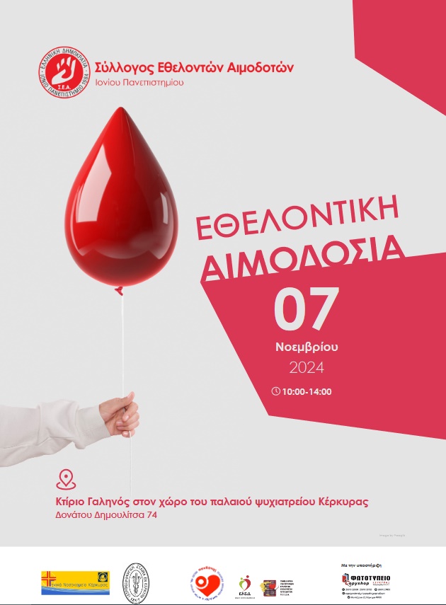 Ο Σύλλογος Εθελοντών Αιμοδοτών του Ιονίου Πανεπιστημίου, σε συνεργασία με το Τμήμα Αιμοδοσίας του Γενικού Νοσοκομείου Κέρκυρας και την Ιατροχειρουργική Εταιρεία Κέρκυρας ανακοινώνει τη διοργάνωση εθελοντικής αιμοδοσίας με την υποστήριξη του Συλλόγου Εθελοντών Αιμοδοτών & Δοτών Μυελού των Οστών Κέρκυρας «Πανδότης» (μέλος της Πανελλήνιας Ομοσπονδίας Συλλόγων Εθελοντών Αιμοδοτών), την Πέμπτη 7 Νοεμβρίου στο κτίριο Γαληνός, που βρίσκεται στο παλαιό ψυχιατρείο (Δονάτου Δημουλίτσα 74), από τις 10:00 έως τις 14:00.