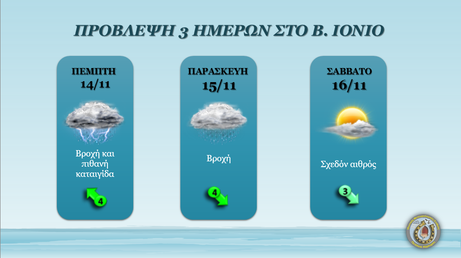 Παρασκευή (15/11), αύξηση των νεφών με βροχές αναμένονται και πάλι πιθανώς να σημειωθούν και καταιγίδες κυρίως πάνω από τη θάλασσα ενώ αργότερα, αυξημένη είναι η πιθανότητα βροχής. Οι άνεμοι θα πνέουν στα Διαπόντια Νησιά ΒΔ 4 και τοπικά 5 μποφόρ. Η θερμοκρασία δεν θα αλλάξει σημαντικά.