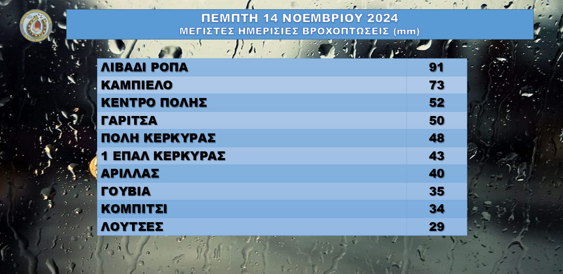 Μεγάλες ποσότητες βροχής σημειώθηκαν στην Κέρκυρα.
