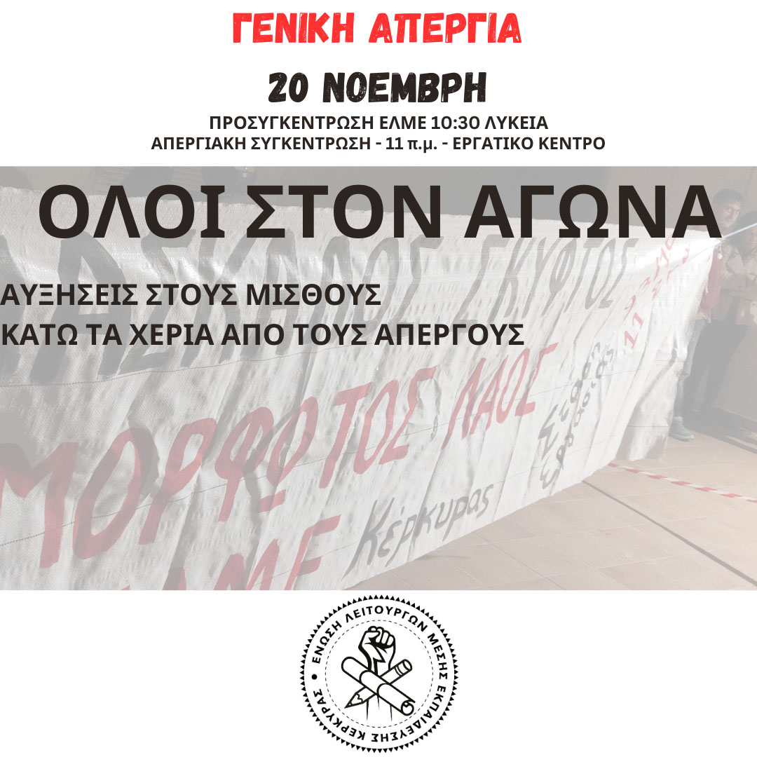 Η ΕΛΜΕ Κέρκυρας καλεί όλους τους συναδέλφους σε μαζική συμμετοχή στην 24ωρη γενική πανεργατική απεργία στις 20 του Νοέμβρη! Να «νεκρώσουν» όλοι οι χώροι δουλειάς και εκείνη τη μέρα να συναντηθούμε στον δρόμο του αγώνα όλοι οι εργαζόμενοι μαζί, σε δημόσιο και ιδιωτικό τομέα.