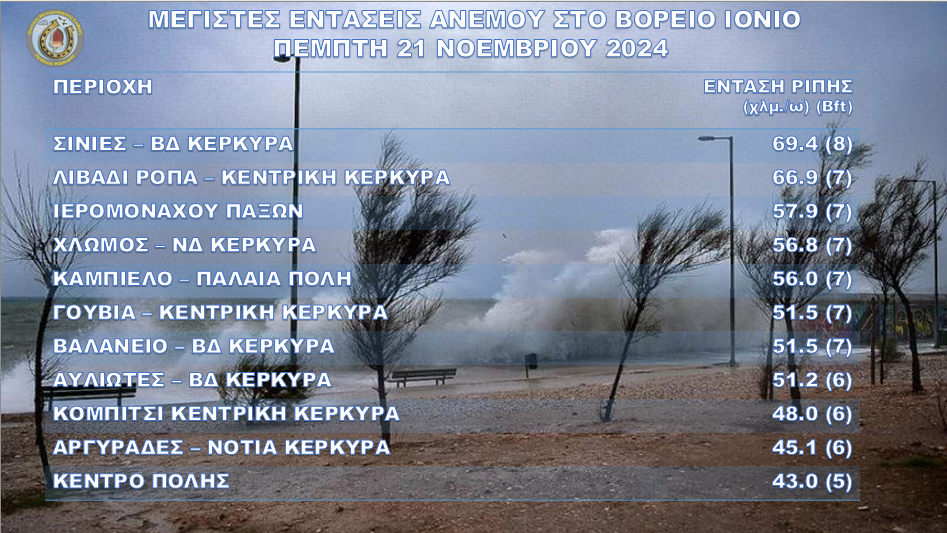 Σύμφωνα με τις καταγραφές του Μετεωρολογικού σταθμού από το δίκτυο WeatherUnderground που βρίσκεται στις Σινιές στην Βορειοανατολική Κέρκυρα την Πέμπτη 21/11, είχαμε ριπές ανέμων 8 μποφόρ με μέγιστη ταχύτητα τα 69.4 Km/hr.