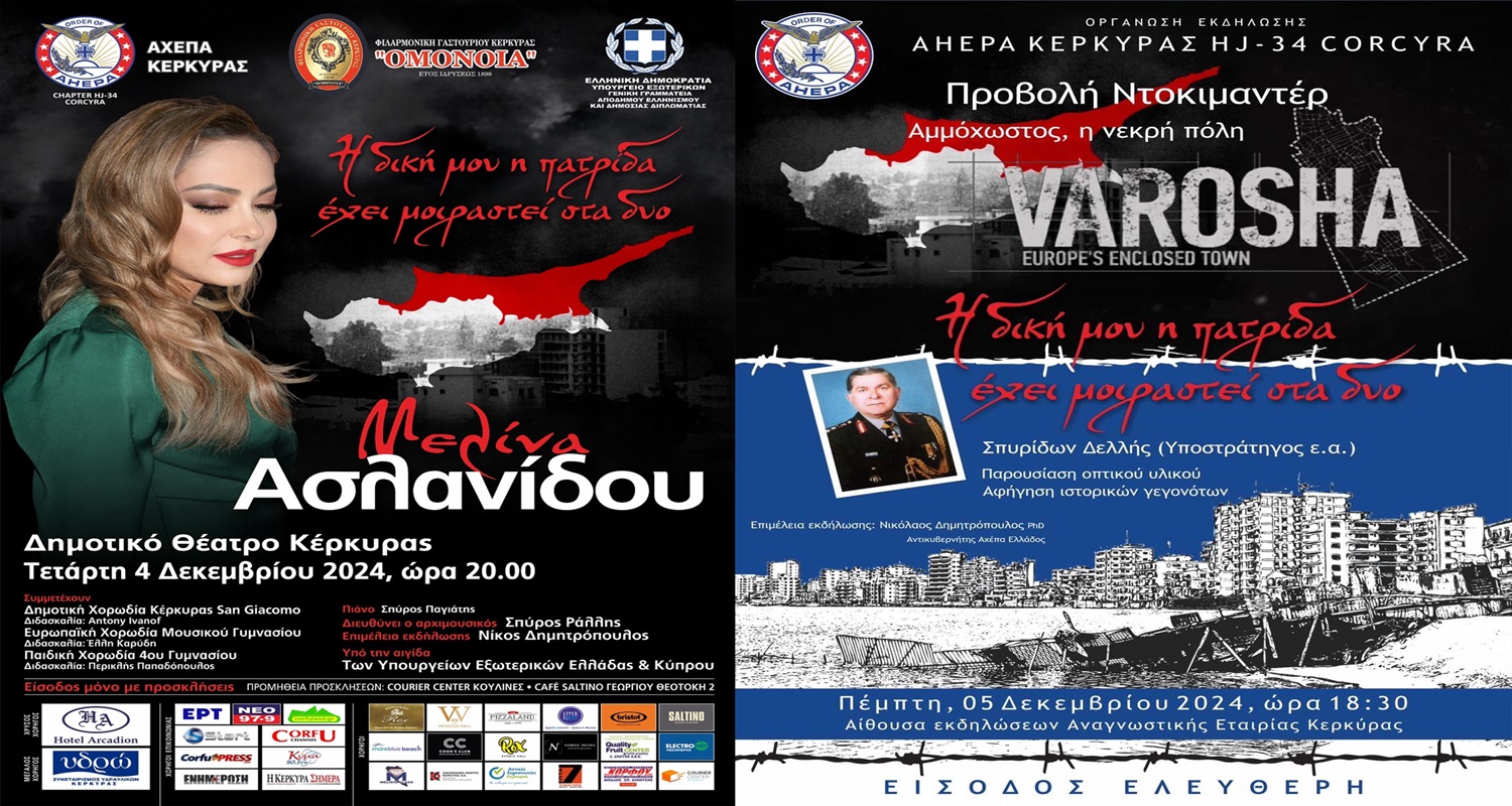 Την επόμενη μέρα 5 Δεκεμβρίου στις 18.30 θα προβληθεί για πρώτη φορά στη Κέρκυρα στην Αναγνωστική Εταιρεία το πολυβραβευμένο από τα δίκτυα euronews στην Ευρώπη και Fox στην Αμερική ντοκιμαντέρ VAROSHA- ΑΜΜΟΧΩΣΤΟΣ η νεκρή πόλη και παράλληλα θα παρουσιαστούν από το Κερκυραίο υποστράτηγο Σπύρο Δελλή επικεφαλής τάγματος της ΕΛΔΥΚ την ημέρα της εισβολής, σπάνια φωτογραφικά ντοκουμέντα και περιγραφική ανάλυση