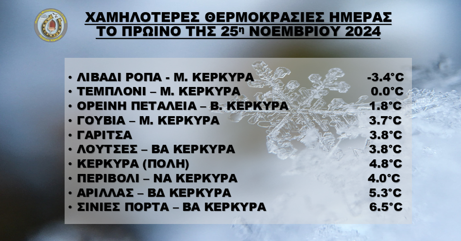 Oι 10 χαμηλότερες ελάχιστες θερμοκρασίες τις πρωινές ώρες της Δευτέρας 25/11, παρουσιάζονται στον παρακάτω πίνακα.
