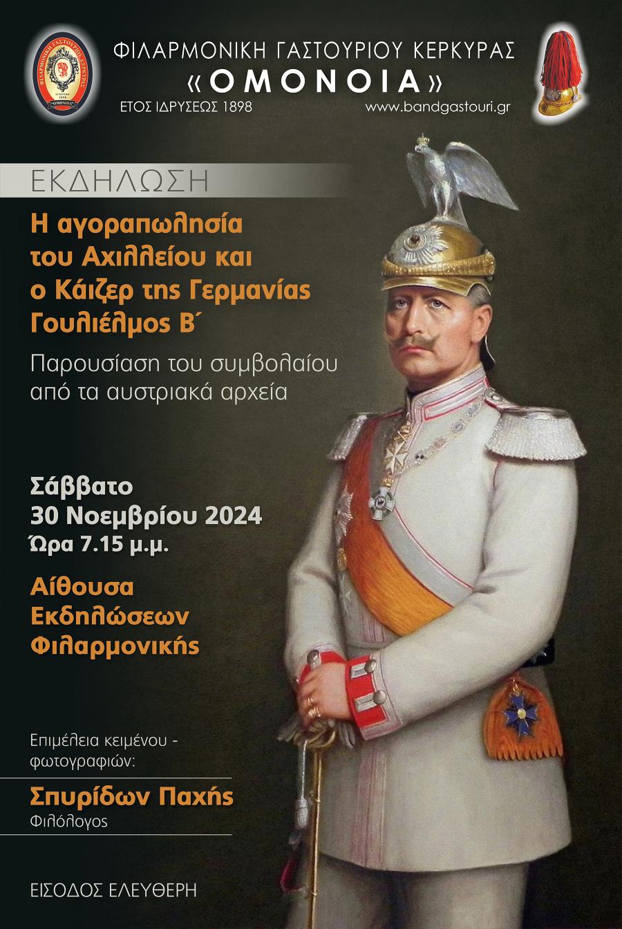 Σας προσκαλούμε στην εκδήλωση της Φιλαρμονικής Γαστουρίου Κέρκυρας ΟΜΟΝΟΙΑ που θα πραγματοποιηθεί το Σάββατο 30 Νοεμβρίου 2024, ώρα 7.15 μ.μ., στην Αίθουσα Εκδηλώσεων του Συλλόγου με ομιλητή το φιλόλογο κ. Σπύρο Παχή και θέμα: «Η Αγοραπωλησία του Αχιλλείου και ο Κάιζερ της Γερμανίας Γουλιέλμος Β΄».