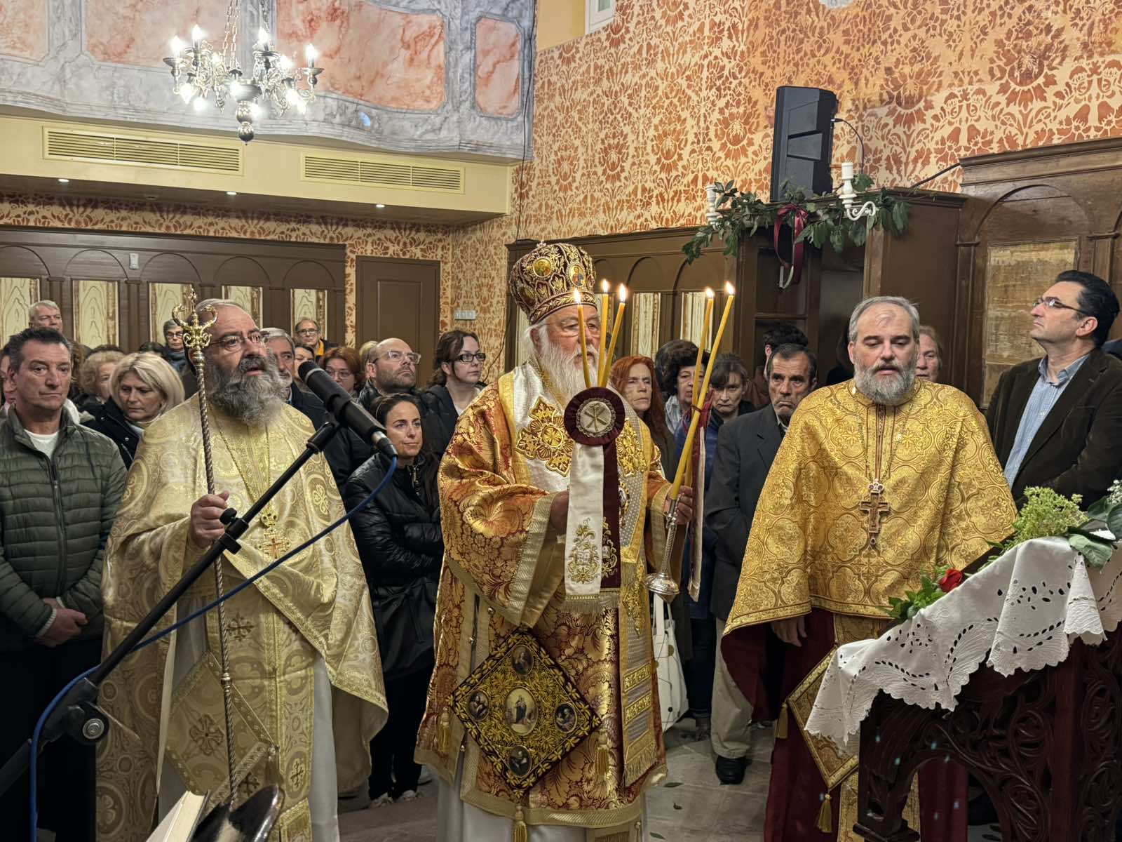 Ο Σεβασμιώτατος, έπειτα από τα αναγνώσματα της Θείας Λειτουργίας, απευθυνόμενος τόσο προς τις Αρχές του τόπου, όσο και προς το εκκλησίασμα, δοξολόγησε από συγκίνηση και ευγνωμοσύνη τον Τριαδικό Θεό που αξιώθηκε πρώτη φορά στα εικοσιδύο χρόνια της ποιμαντορίας του να ιερουργεί στον εν λόγω νεοανακαινισθέντα ιστορικό και παλαίφατο Ιερό Ναό της Αγίας Αικατερίνης. Αφού συνεχάρη όλους τους συνεργήσαντας για την ανακαίνιση του Ιερού Ναού, ανεφέρθη στο πρόσωπον της Αγίας Αικατερίνης, στη ζωή της πανεύφημης αυτής νύμφης του Χριστού, η οποία προκλήθηκε εις γάμον κοινωνίαν και απέρριψε αυτήν την πρόταση λέγοντας πως εάν θα εύρισκε κάποιον ο οποίος θα ήταν σοφότερος εκείνης ή ωραιότερος τότε θα επείθετο. Για αυτό το λόγο και της εκόμισαν πλειάδα φιλοσόφων, επιστημόνων δηλαδή της εποχής, ώστε η ίδια να αποφασίσει για τη ζωή της. Πλην όμως, τους κατατρόπωσε με τη σοφία με την οποία ήταν προικισμένη. Όμως, η σοφία αυτή δεν προερχόταν μόνον από τη θύραθεν παιδεία αλλά κυρίως από της σοφία του Θεού. Για αυτό το λόγο, αντέταξε τους σοφούς – κομψούς των ασεβών δια της μαχαίρας του Πνεύματος. Αναφορικά δε με την ωραιότητα, την αντέταξε με την ωραιότητα τους Νυμφίου Χριστού. Ως αποτέλεσμα, δέχθηκε το μαρτύριον και προσέφερε την καθαρότητα της ψυχής της, την αληθινή αγάπη προς το Νυμφίο Χριστό και είχε στηριγμό την ελπίδα και την δύναμη της πίστεως.