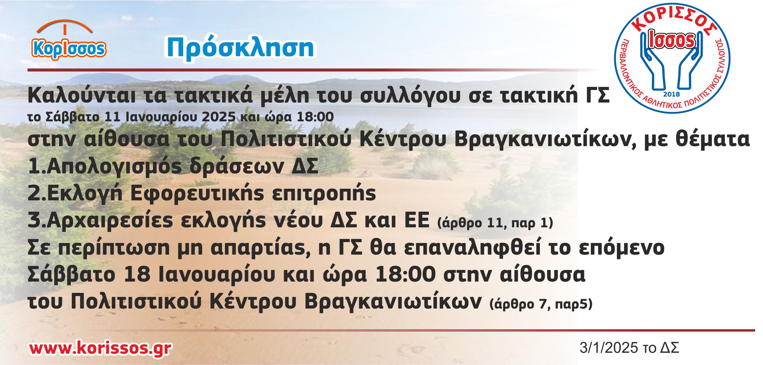 Ο Περιβαλλοντικός, Αθλητικός, Πολιτιστικός Σύλλογος ΚΟΡΙΣΣΟΣ θα πραγματοποιήσει εκλογές για την ανάδειξη νέου ΔΣ το Σάββατο.