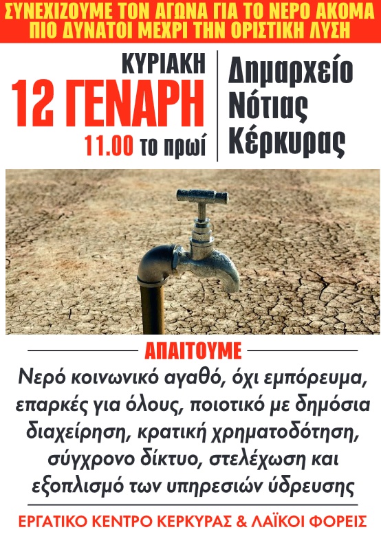 Το Εργατικό Κέντρο Κέρκυρας διοργανώνει μια σειρά από κινητοποιήσεις το επόμενο διάστημα με στόχο να λυθεί οριστικά το πρόβλημα της λειψυδρίας. Η πρώτη κινητοποίηση θα γίνει στις 11 το πρωί της Κυριακής στο Δημαρχείο Νότιας Κέρκυρας.