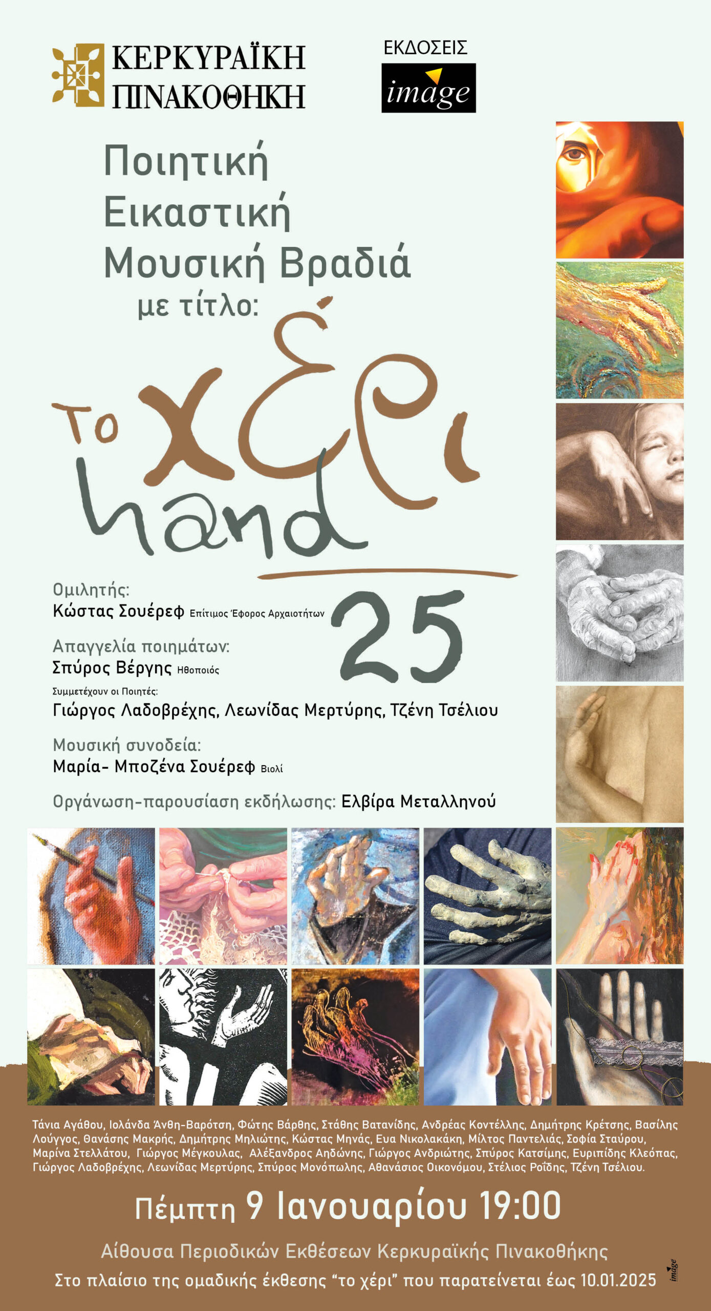 Οι εκδόσεις “image”, και η Κερκυραϊκή Πινακοθήκη σας προσκαλούν σε μια βραδιά ποίησης, ζωγραφικής και μουσικής, με τίτλο: «το χέρι», την Πέμπτη 9 Ιανουαρίου 2025, στις επτά το βράδυ, στην Αίθουσα Περιοδικών Εκθέσεων της Πινακοθήκης.