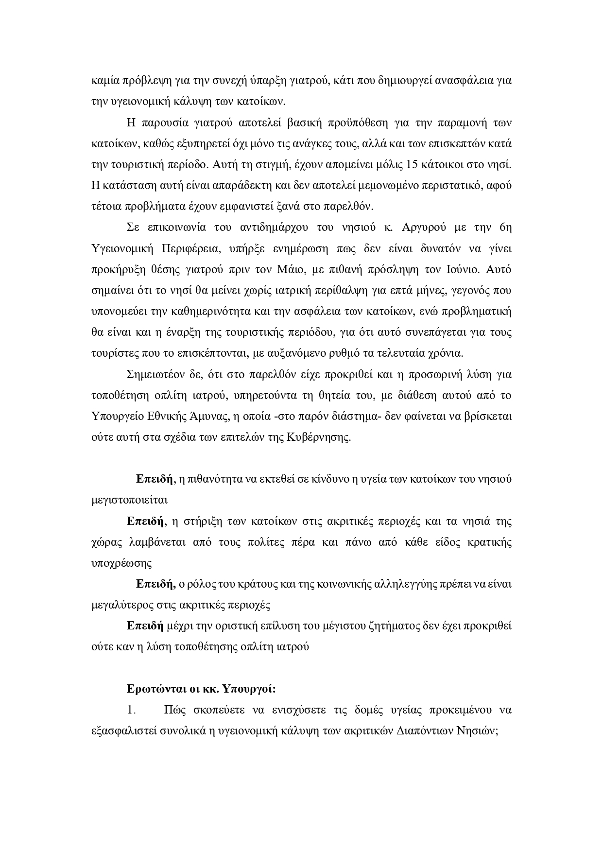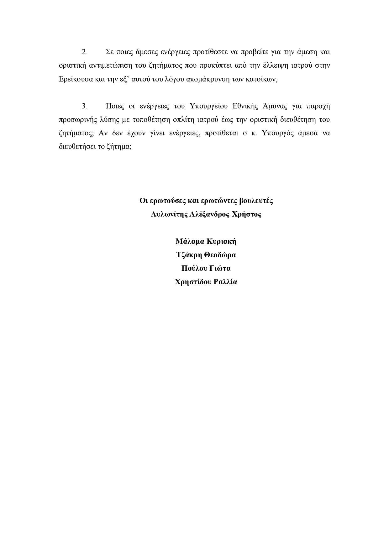 Οι βουλευτές υπογραμμίζουν πως η άμεση τοποθέτηση γιατρού στην Ερείκουσα είναι απαραίτητη όχι μόνο για τους μόνιμους κατοίκους αλλά και για την ομαλή λειτουργία του νησιού κατά την τουριστική περίοδο. Η υγειονομική θωράκιση των ακριτικών περιοχών είναι θεμελιώδης υποχρέωση της Πολιτείας και ζήτημα στοιχειώδους κοινωνικής αλληλεγγύης προς τους μόνιμους κατοίκους που επιλέγουν να ζουν στα νησιά αυτά, παρά τις αντιξοότητες.
