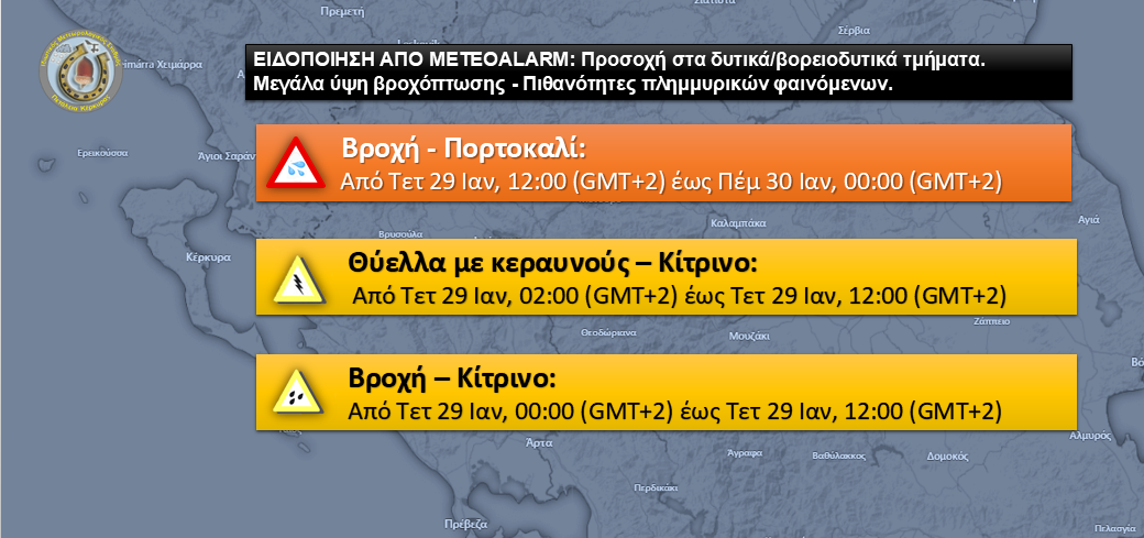 Υπάρχει πορτοκαλί και κίτρινο προειδοποίηση για κακοκαιρία από το meteoalarm, σε ισχύ από Τέταρτη (29/01) το μεσημέρι έως τα μεσάνυχτα.