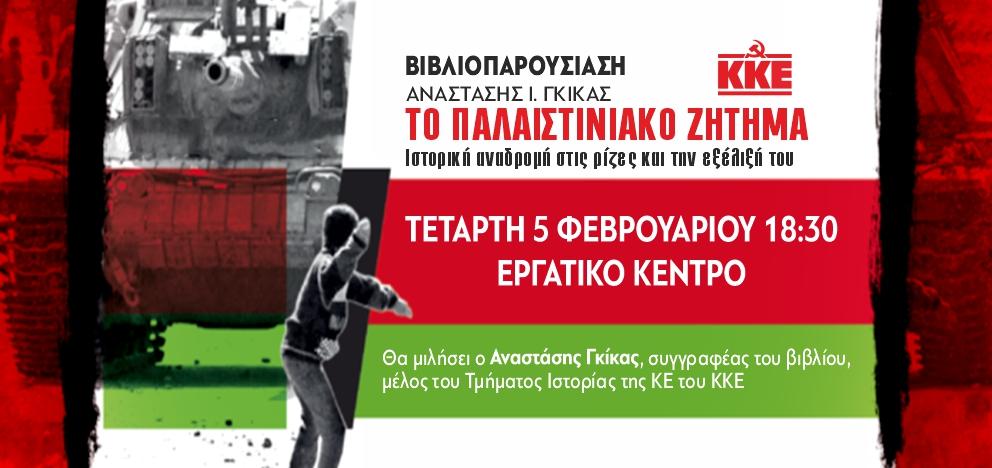 Η Τομεακή Επιτροπή Κέρκυρας του ΚΚΕ διοργανώνει την Τετάρτη 5 Φεβρουαρίου, στις 18:30 στο Εργατικό Κέντρο, εκδήλωση παρουσίασης του βιβλίου: «Το Παλαιστινιακό ζήτημα. Ιστορική αναδρομή στις ρίζες και την εξέλιξή του». Την παρουσίαση θα κάνει ο συγγραφέας του βιβλίου Αναστάσης Γκίκας, μέλος του Τμήματος Ιστορίας της ΚΕ του ΚΚΕ.