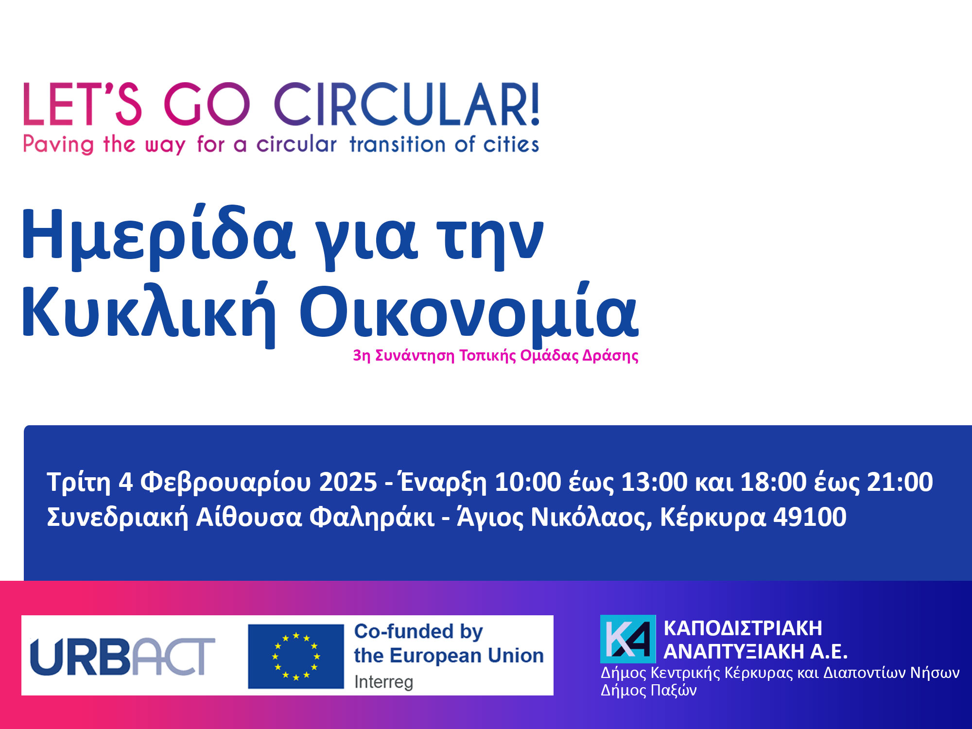 Hμερίδα με θέμα «Κυκλική Οικονομία» διοργανώνεται στο πλαίσιο της συμμετοχής της Καποδιστριακής Αναπτυξιακής Α.Ε. στο Ευρωπαϊκό Πρόγραμμα «URBACT IV – Let’s Go Circular!».