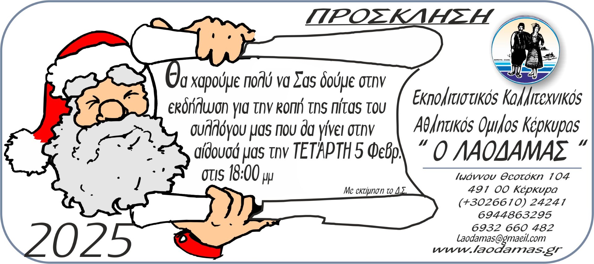 Η διοίκηση του Λαοδάμα καλεί τα μέλη και τους φίλους του στην καθιερωμένη εκδήλωση της «πίτας», την Τετάρτη 5 Φεβρουαρίου στις 18:00 στο «Κέντρο Πολιτισμού Δημήτριος Κάντας», πάροδος Ιωάννου Θεοτόκη 104.