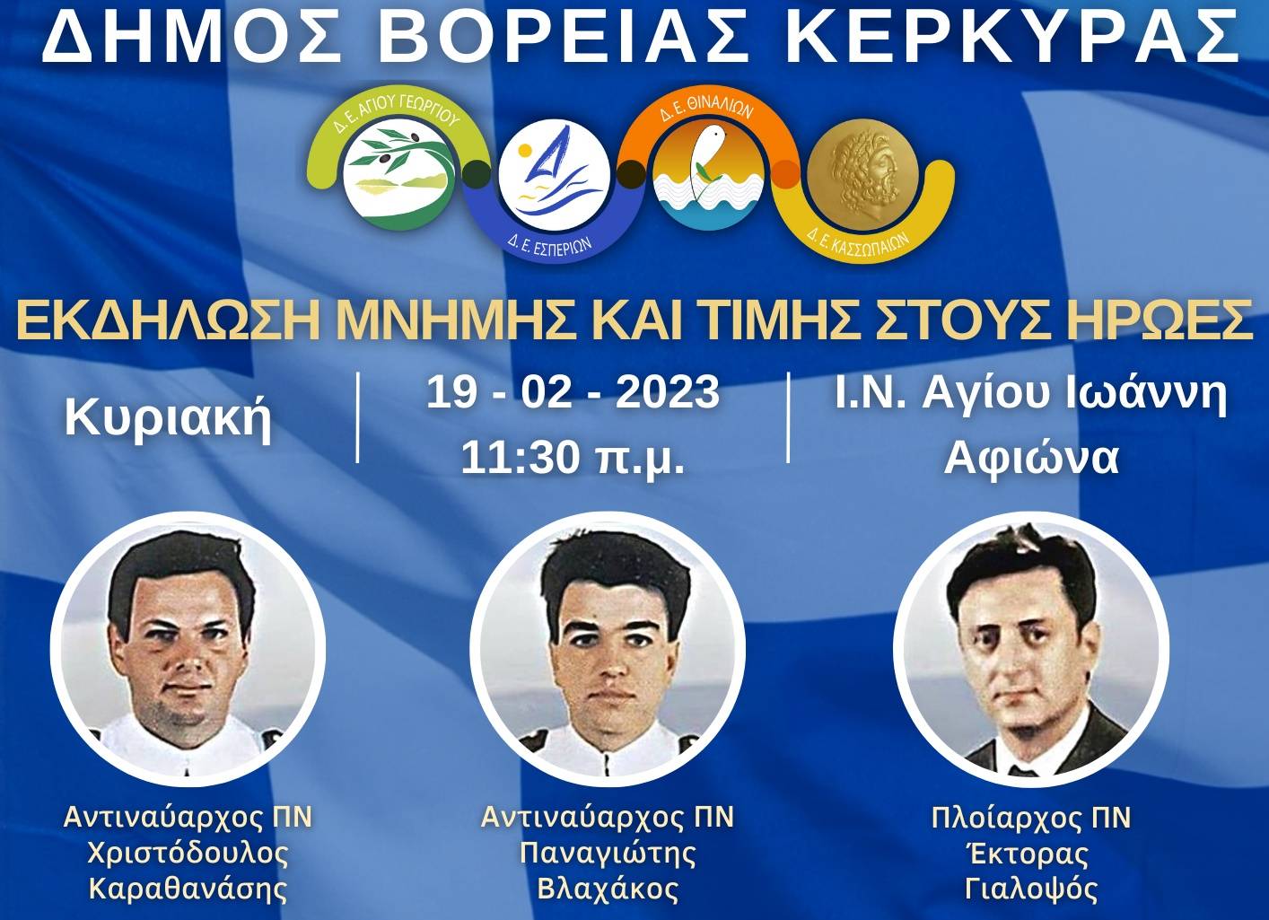 Ο Δήμος Βόρειας Κέρκυρας σε συνεργασία με τον Πρόεδρο και το τοπικό Συμβούλιο Αφιώνα, τον Πολιτιστικό Σύλλογο, το Εκκλησιαστικό Συμβούλιο Αφιώνα και την οικογένεια του Ήρωα του Π.Ν Πλοίαρχου Έκτορα Γιαλοψού με αίσθημα βαθιάς συγκίνησης ,εθνικής υπερηφάνειας και αμέριστου σεβασμού, διοργανώνoυν την ετήσια εκδήλωση Μνήμης και Τιμής αποτίοντας φόρο τιμής στους ήρωες που έγραψαν ιστορία με το αίμα τους, υπερασπιζόμενοι την πατρίδα ,και δη στον συντοπίτη μας Πλοίαρχο του ΠΝ Έκτορα Γιαλοψό, στον Αντινάυαρχο ΠΝ Χριστόδουλο Καραθανάση, και στον Αντιναύαρχο ΠΝ Παναγιώτη Βλαχάκο την ΚΥΡΙΑΚΗ 09 ΦΕΒΡΟΥΑΡΙΟΥ 2025 στις 11 το πρωί στον Ιερό Ναό Αγίου Ιωάννη Αφιώνα. Η θυσία τους ήταν ένα αιώνιο σύμβολο θάρρους, αυταπάρνησης και καθήκοντος.