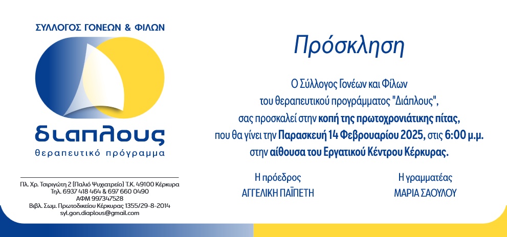Ο Σύλλογος Γονέων και Φίλων του θεραπευτικού προγράμματος “Διάπλους”, διοργανώνει την κοπή της πρωτοχρονιάτικης πίτας, την Παρασκευή 14 Φεβρουαρίου 2025, στις 6:00 μ.μ. στην αίθουσα του Εργατικού Κέντρου Κέρκυρας.