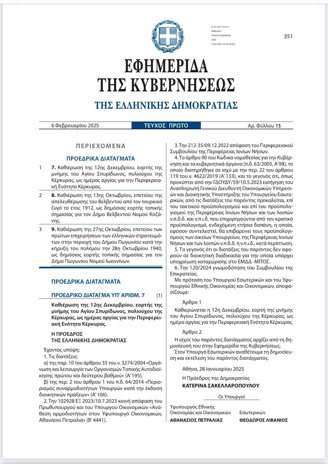 «Καθιερώνεται η 12η Δεκεμβρίου, εορτή της μνήμης του Αγίου Σπυρίδωνος, πολιούχου της Κέρκυρας, ως ημέρα αργίας για την ΠΕ Κέρκυρας».