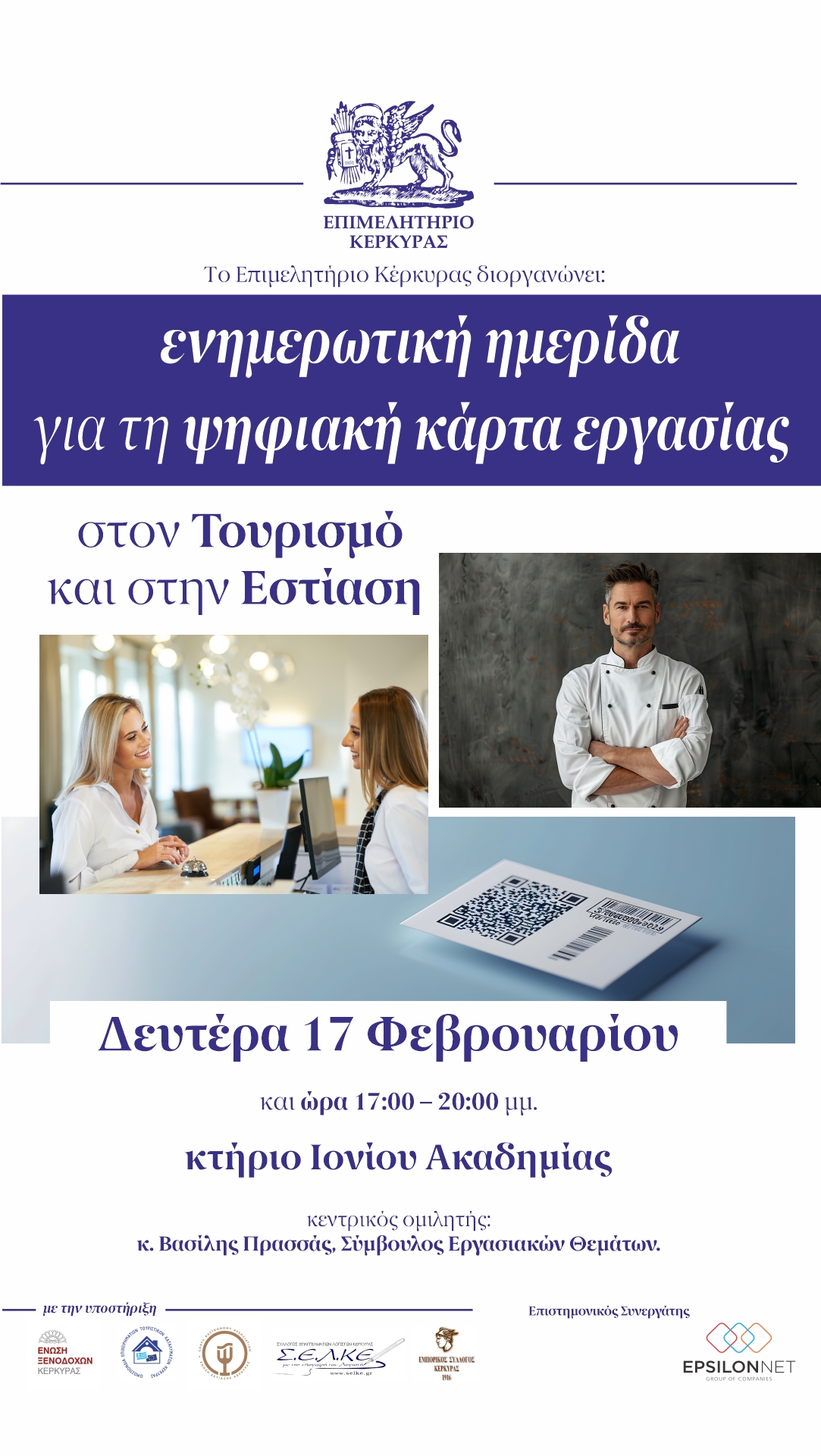 Το Επιμελητήριο Κέρκυρας σας προσκαλεί στην ενημερωτική ημερίδα για την Ψηφιακή Κάρτα Εργασίας που θα πραγματοποιηθεί την Δευτέρα 17 Φεβρουαρίου και ώρα 17:00 μμ. στην αίθουσα τελετών της Ιονίου Ακαδημίας με κεντρικό ομιλητή τον κ. Βασίλη Πρασσά, Σύμβουλο Εργασιακών Θεμάτων.