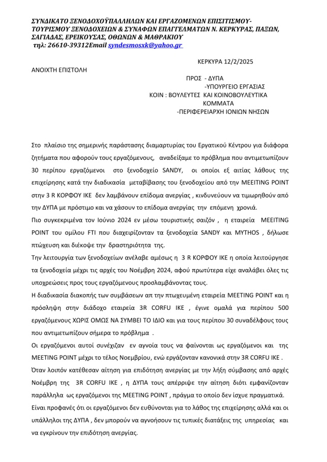 Καταθέτουμε ΑΝΑΦΟΡΑ την Επιστολή του Συνδικάτου Ξενοδοχοϋπαλλήλων και Εργαζομένων Επισιτισμού-Τουρισμού Ξενοδοχείων & Συναφών Επαγγελμάτων Ν. Κέρκυρας, Παξών, Σαγιάδας, Ερεικούσας. Οθώνων & Μαθρακίου, στην οποία ζητούν να λάβουν οι 30 πρώην εργαζόμενοι στο ξενοδοχείο SANDY της εταιρείας 3 R ΚΟΡΦΟΥ ΙΚΕ το επίδομα ανεργίας, επειδή πληρούν όλους τους όρους και τις προϋποθέσεις και δεν ευθύνονται οι ίδιοι για τα λάθη που έχουν γίνει.