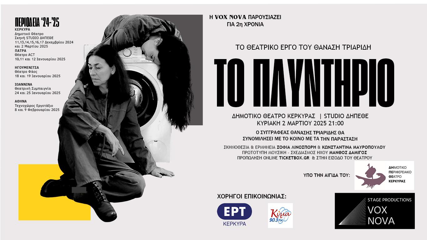 Η Vox Nova, μετά την επιτυχημένη περιοδεία της στην Ελλάδα, επιστρέφει στην Κέρκυρα για μια τελευταία παράσταση του έργου «Το Πλυντήριο» την Κυριακή 02 Μαρτίου στο Studio του ΔΗ.ΠΕ.ΘΕ. Κέρκυρας στις 9 το βράδυ.