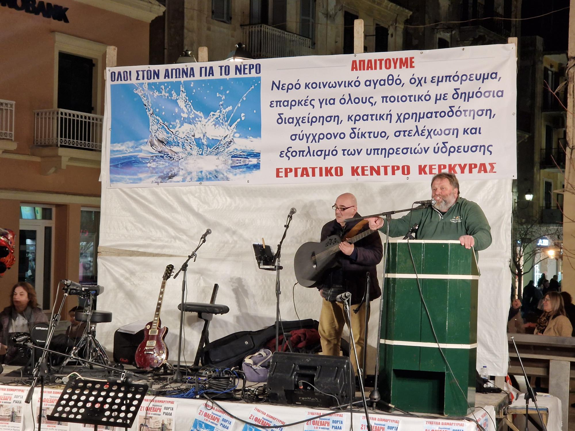 Η συγκέντρωση ξεκίνησε με ομιλίες εκπροσώπων των διοργανωτών, οι οποίοι τόνισαν ότι η πλειοψηφία των κατοίκων της Κέρκυρας στερείται πόσιμου νερού εδώ και χρόνια. Παράλληλα, αναφέρθηκαν στα απαρχαιωμένα δίκτυα ύδρευσης που αποβάλλουν τεράστιες ποσότητες νερού, ενώ η πίεση και η ποσότητα δεν επαρκούν για να καλύψουν τις ανάγκες περιοχών με υψηλότερο υψόμετρο.