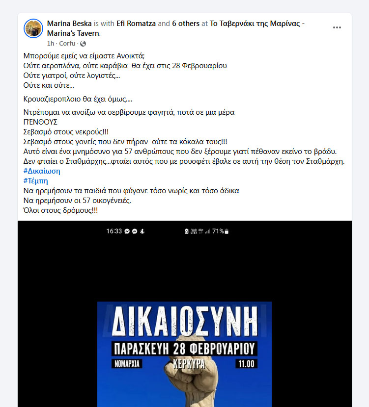 “Ούτε αεροπλάνα, ούτε καράβια θα έχει στις 28 Φεβρουαρίου. Ούτε γιατροί, ούτε λογιστές… Ούτε και ούτε… Κρουαζιεροπλοιο θα έχει όμως.… Ντρέπομαι να ανοίξω να σερβίρουμε φαγητά, ποτά σε μια μέρα ΠΈΝΘΟΥΣ. Σεβασμό στους νεκρούς!”