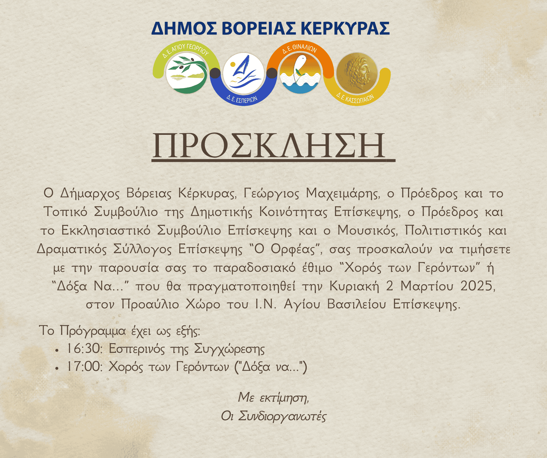 ΚΟΙΝΩΝΙΑΕΛΕΥΘΕΡΟΕΙΔΗΣΕΙΣ Την Κυριακή, ο χορός των Γερόντων στην Επίσκεψη Την Κυριακή 2 Μαρτίου στον Προαύλιο χώρο του Ι.Ν Αγίου Βασιλείου Επίσκεψης. Last updated: 06/10/2025 16:31 CorfuPress.com Published: 27/02/2025 Share SHARE Την Κυριακή 2 Μαρτίου στον Προαύλιο χώρο του Ι.Ν Αγίου Βασιλείου Επίσκεψης. Την Κυριακή, ο χορός των Γερόντων στην Επίσκεψη Share This Article Facebook Whatsapp Whatsapp Email Copy Link Print Previous Article Πρώτα έριξε πολύ νερό, μετά “έριξε” μήνυμα το 112! Next Article Ευχαριστήριο της οικογένειας του Θανάση Μιχαλά Δεν υπάρχουν Σχόλια Δεν υπάρχουν Σχόλια Αφήστε μια απάντηση Ακύρωση απάντησηςΗ ηλ. διεύθυνση σας δεν δημοσιεύεται. Τα υποχρεωτικά πεδία σημειώνονται με *Σχόλιο * Όνομα * Email * Ιστότοπος Αποθήκευσε το όνομά μου, email, και τον ιστότοπο μου σε αυτόν τον πλοηγό για την επόμενη φορά που θα σχολιάσω. ΑναζήτησηΑναζήτησηRecent PostsΌλα τα μάτια στον Θοδωρή, τον καπετάνιο μας! Τη Δευτέρα 22 Σεπτεμβρίου γιορτάζει… Σαν Σήμερα 22/9: Τα σημαντικότερα γεγονότα… Η πρόγνωση του καιρού Έφηβοι Ιονίου: Με περίπατο, συνεχίζουν στο Rising Stars! Recent CommentsΧωρίς σχόλια για εμφάνιση.
