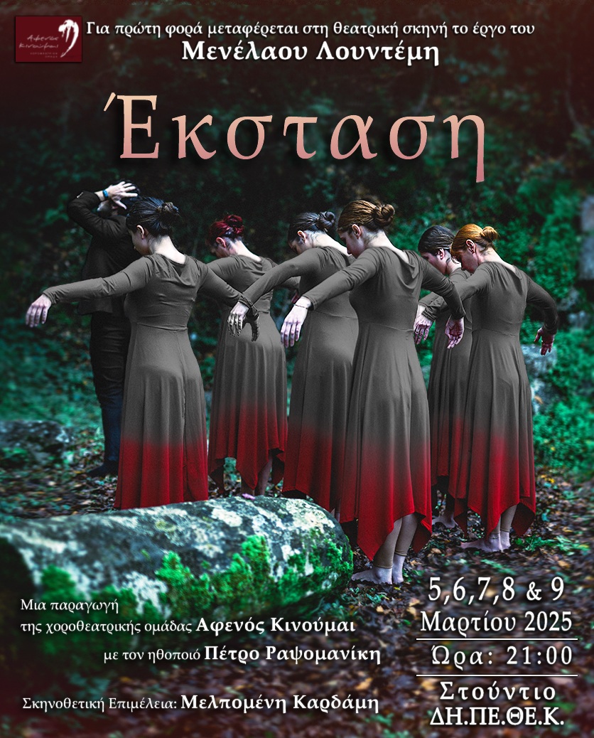 Το ΑΦΕΝΟΣ ΚΙΝΟΥΜΑΙ σε ένα νέο εγχείρημα. Πρόκειται για την πρώτη σκηνική μεταφορά του λυρικού μυθιστορήματος του Μενέλαου Λουντέμη «ΕΚΣΤΑΣΗ», ενός έργου πολύ ιδιαίτερου και διαφορετικού στη σύλληψη και στο ξεδίπλωμά του από τα υπόλοιπα. Ο ίδιος ο συγγραφέας χαρακτηρίζει το έργο του αυτό “μυθοφαντασία” καθώς αποκαλύπτει τις αναζητήσεις του αναφορικά με το νόημα της ζωής, την ευτυχία, τον ιδανικό έρωτα, την μοναξιά, το αναπόφευκτο του θανάτου, το ρόλο της τέχνης στη ζωή…