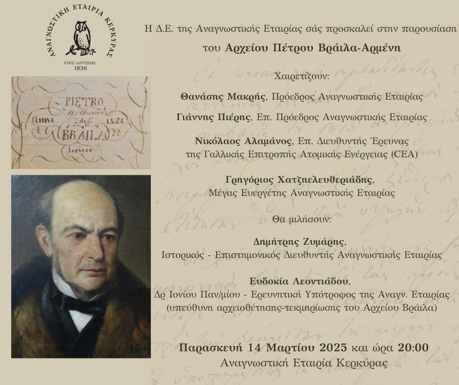 Η Δ.Ε. της Αναγνωστικής Εταιρίας Κερκύρας διοργανώνει την παρουσίαση του Αρχείου Πέτρου Βράιλα-Αρμένη, που θα πραγματοποιηθεί την Παρασκευή 14 Μαρτίου, στις 20:00, στην Αναγνωστική Εταιρία Κερκύρας.
