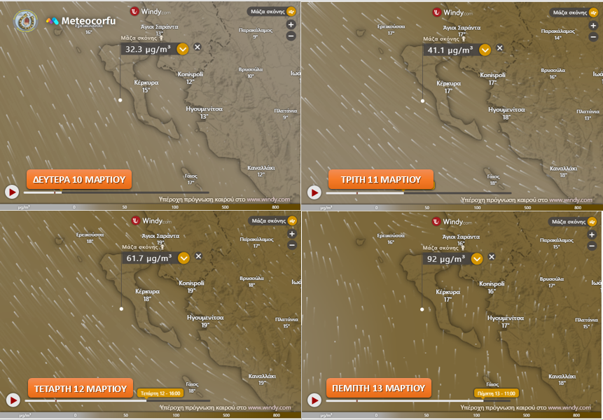 Σύμφωνα με τα τελευταία προγνωστικά στοιχεία από τον μετεωρολογικό σταθμό Πετάλεια Κέρκυρας, οι άνεμοι έχουν ήδη στραφεί από το πρωί σε νότιους. Αυτή η αλλαγή ευνοεί μια έντονη μεταφορά Αφρικανικής σκόνης μέσα στις επόμενες ώρες, η οποία αναμένεται να καλύψει το μεγαλύτερο μέρος του Βόρειου Ιόνιου και του νομού Κέρκυρας.