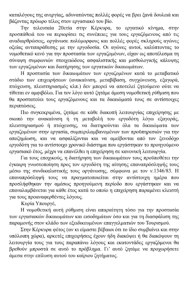 Θέμα: Για την διατήρηση όλων των δικαιωμάτων των εργαζομένων στον κλάδο του τουρισμού σε κάθε διακοπή λειτουργίας επιχείρησης