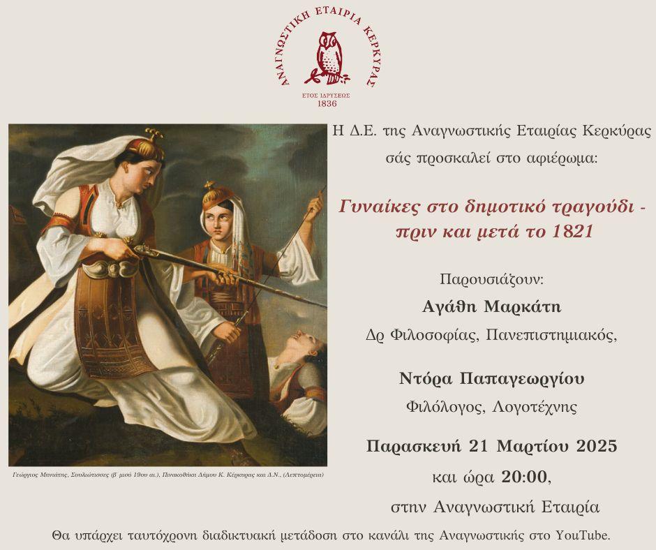 Η Δ.Ε. της Αναγνωστικής Εταιρίας Κερκύρας διοργανώνει το αφιέρωμα: «Γυναίκες στο δημοτικό τραγούδι – πριν και μετά το 1821»