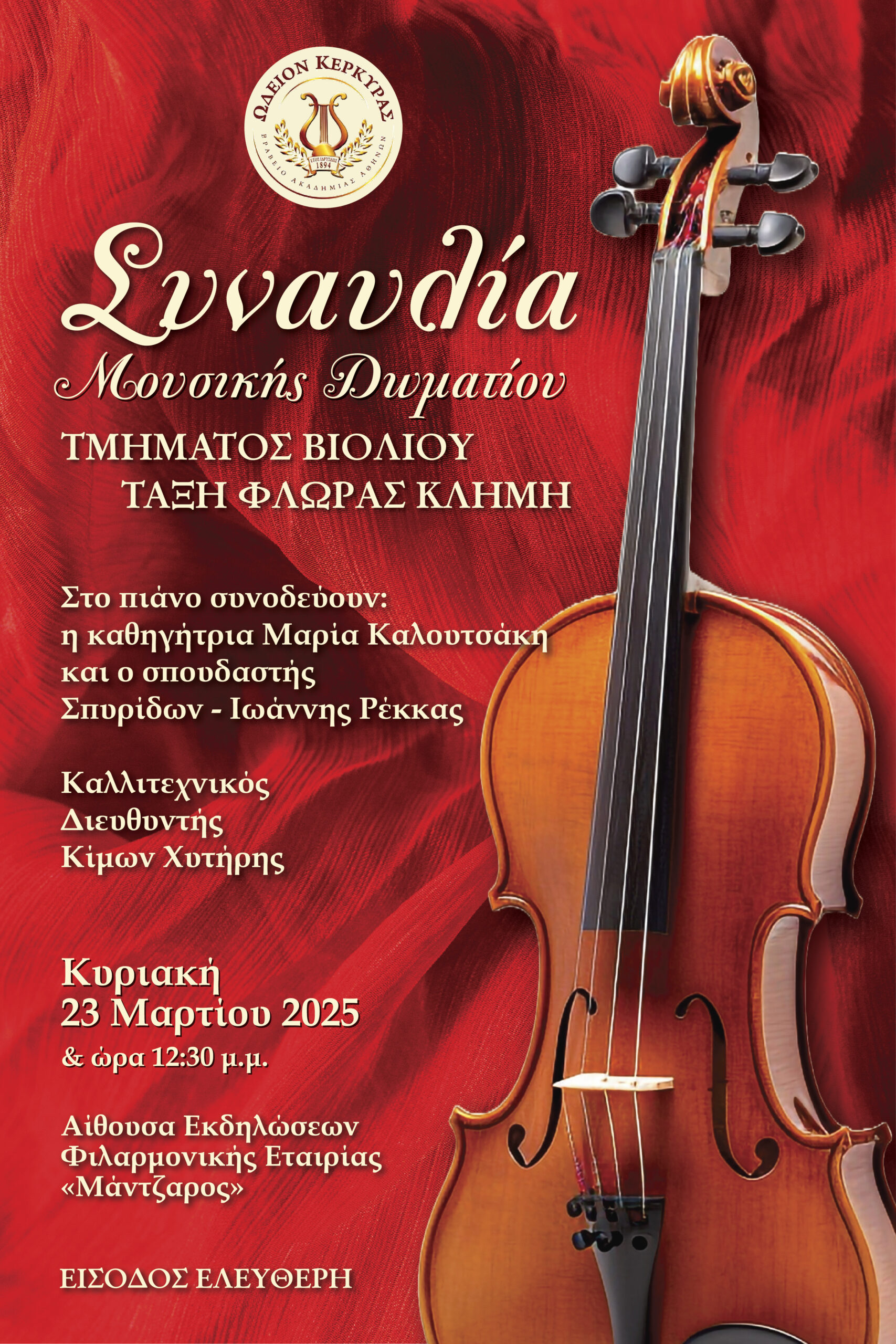 Συναυλία Μουσικής Δωματίου του τμήματος βιολιού του Ωδείου Κερκύρας (τάξη καθηγήτριας Φλώρας Κλήμη) θα πραγματοποιηθεί την Κυριακή 23 Μαρτίου 2025 στις 12.30 μ.μ. στην Αίθουσα Εκδηλώσεων της Φιλαρμονικής Εταιρίας «Μάντζαρος».