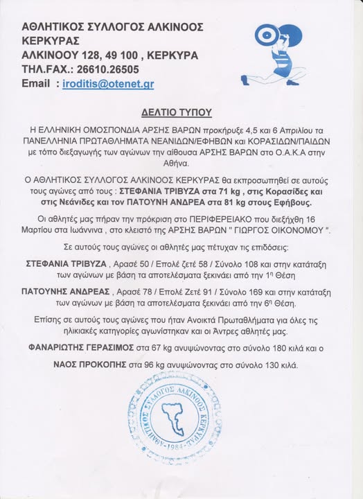 Το κερκυραϊκό σωματείο θα εκπροσωπηθεί στο Πανελλήνιο Ε/Ν και Π/Κ από τη Στεφανία Τριβυζά στις Κορασίδες και στις Νεανίδες και τον Ανδρέα Πατούνη στους Εφήβους.